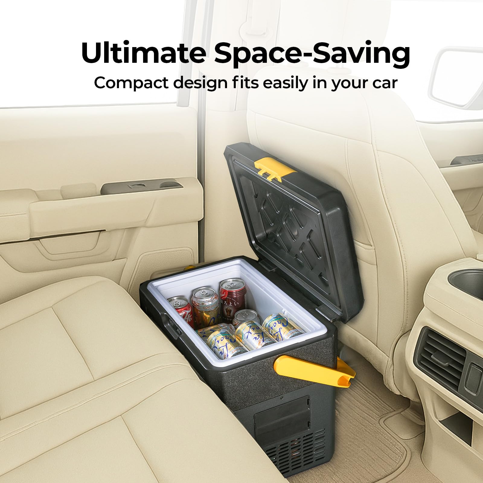 - 19 Quart Generous Capacity: This compact freezer can hold up to 25 cans of 12 fl oz soda or 15 bottles of 16.9 fl oz water, making it ideal for 1-2 people. Great for camping, road trips, and other outdoor activities, enjoy the convenience of chilled beverages and food on the go