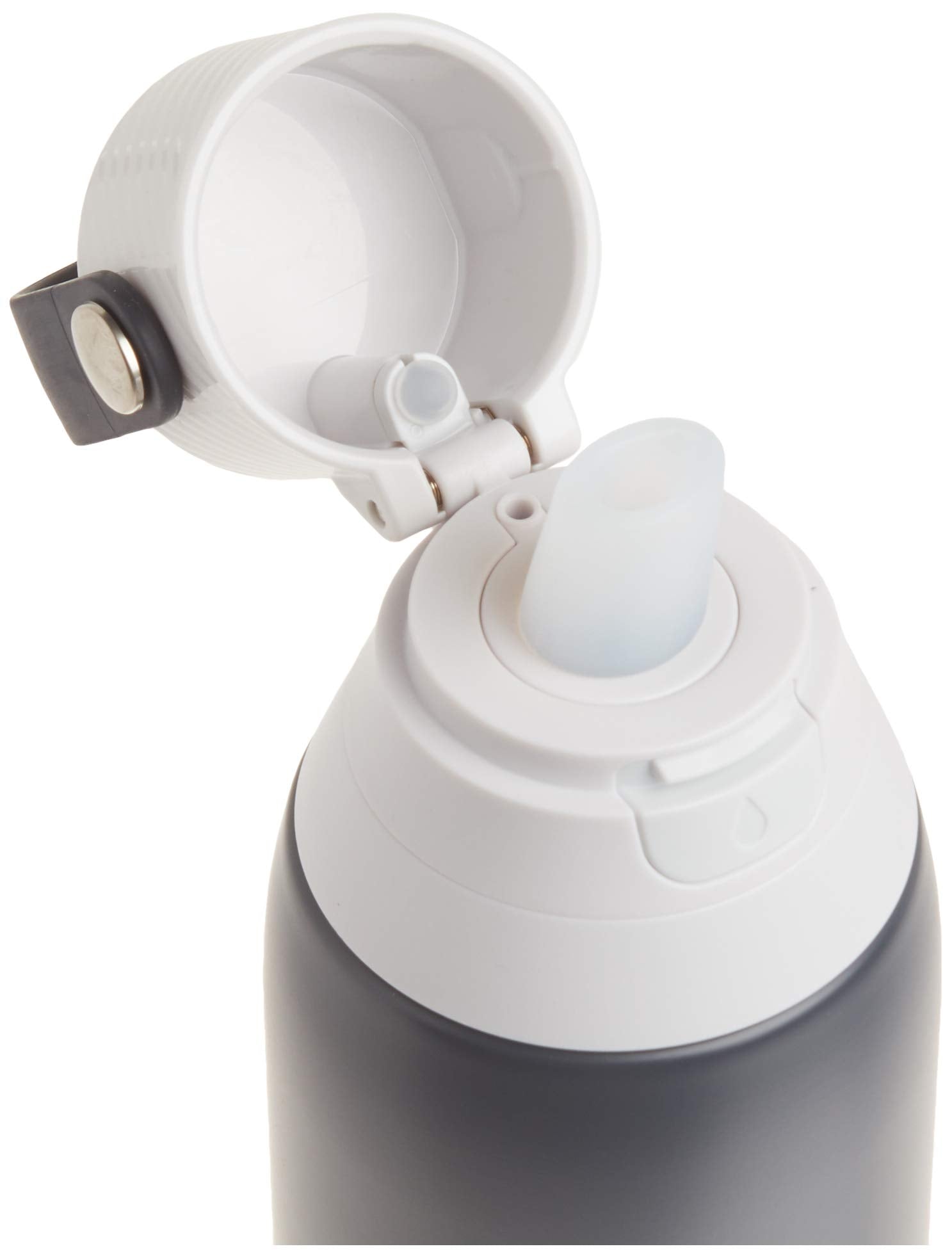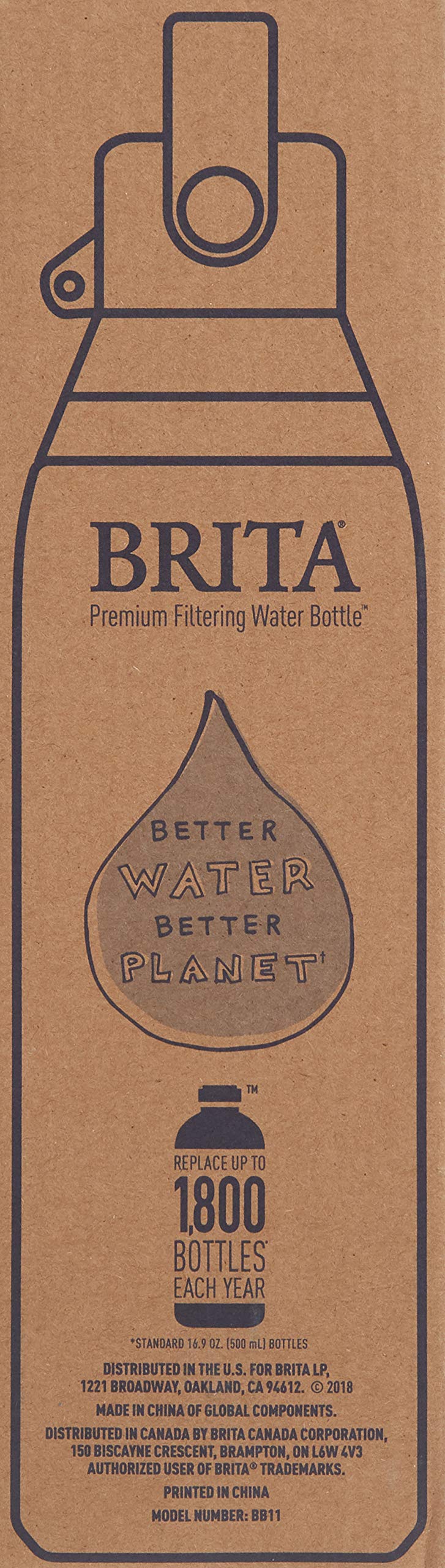 Details: Drink healthier, great-tasting tap water with the BPA-free Brita Stainless Steel Premium Filtering Water Bottle. This durable, double-wall insulated filtered water bottle stays cold for a full 24 hours, making it fantastic for long road trips, all-day sports tournaments or office use. The Brita water filter bottle utilizes an activated carbon block filter to cut the taste and odor of chlorine and reduce particulates in water as you drink. You can also replace 300 standard 16.9-oz. single-use plastic water bottles with just one water bottle filter. It's an easy way to stay hydrated, save money and reduce plastic waste. Created for effortless convenience, this water bottle features an enclosed, easy-sip straw, a built-in carrying loop for grab-and-go portability and a one-handed push-button lid. A leakproof water bottle design helps you avoid surprise drips and spills. This water bottle is compatible with Brita water bottle replacement filters, which should be changed every 40 gallons or about every two months. Get great taste, less waste and more savings from Brita.