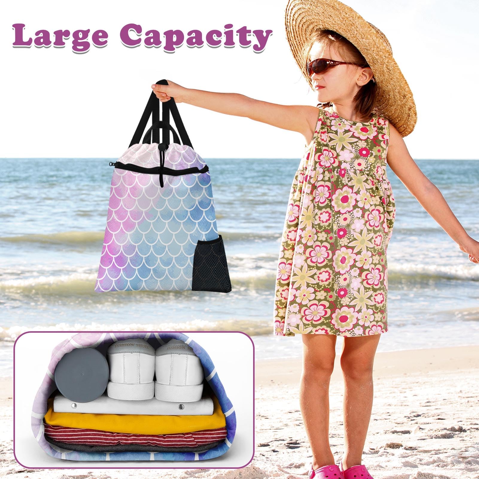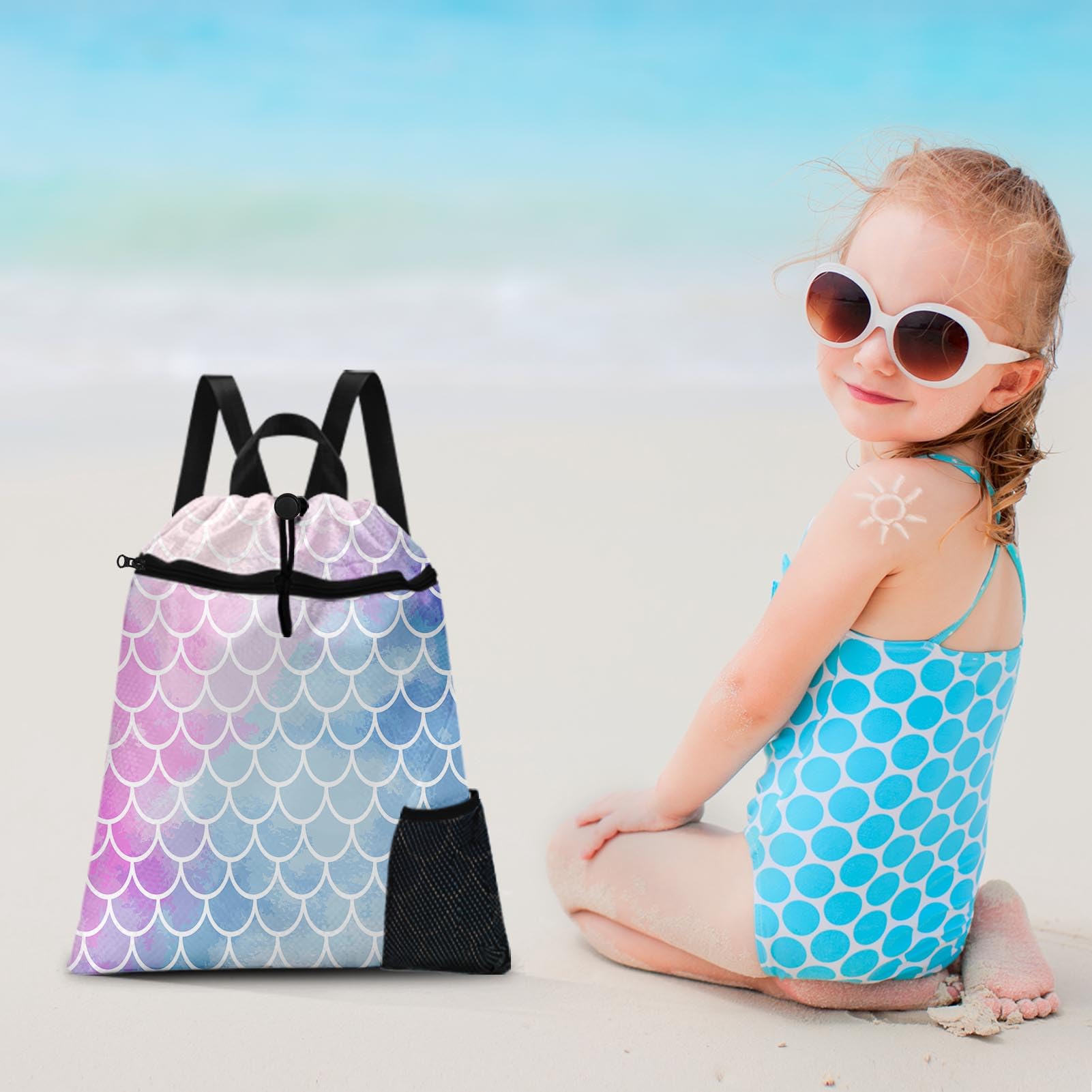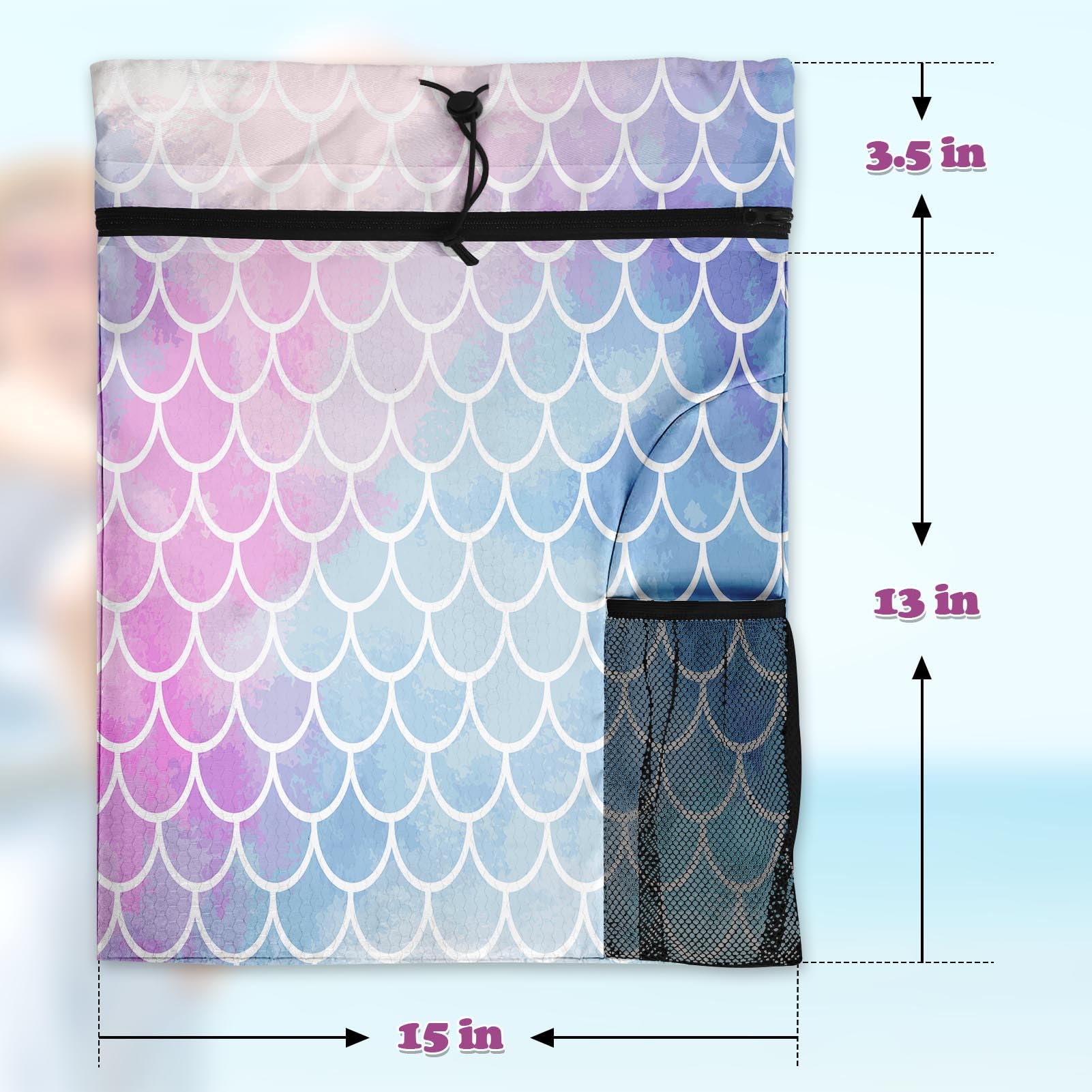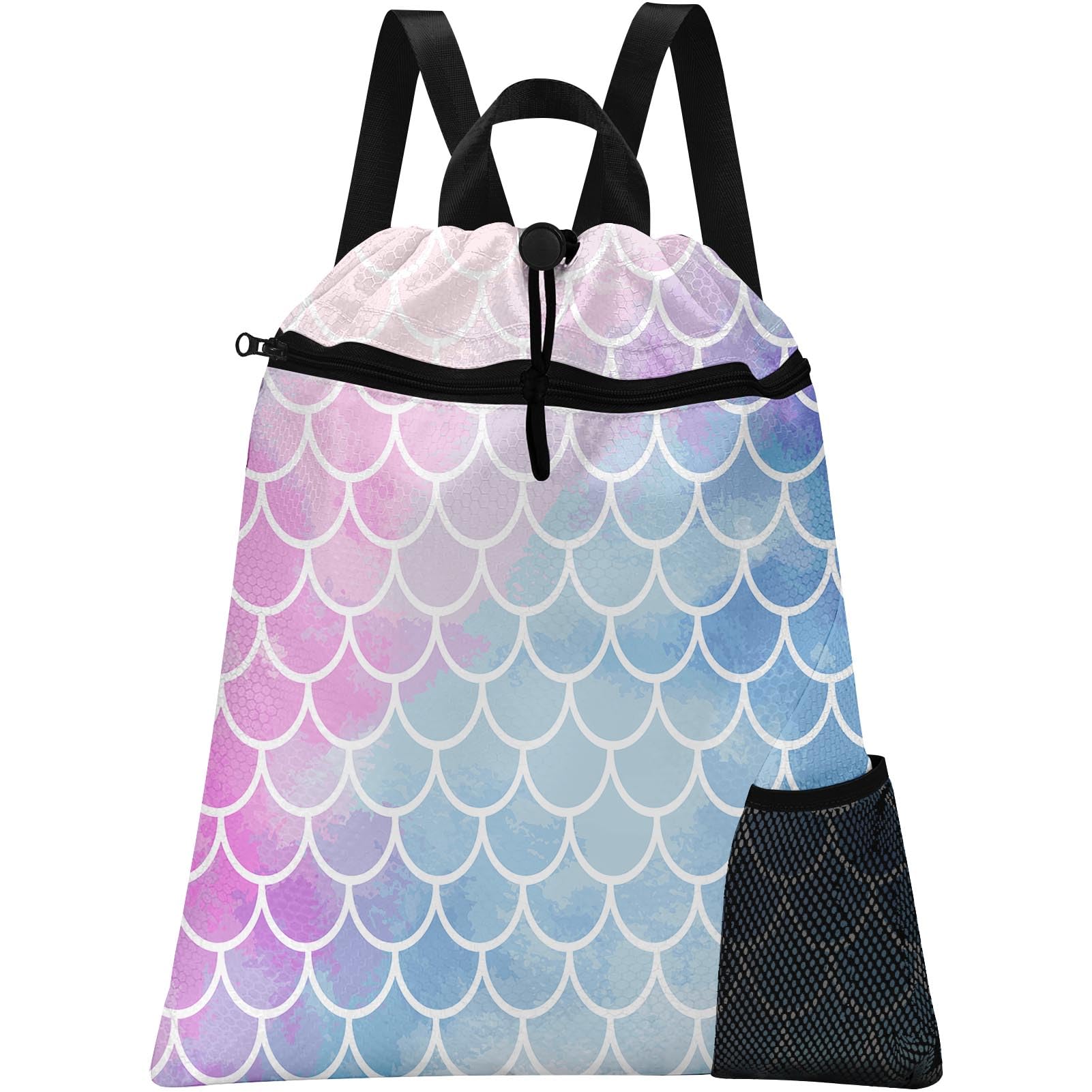 - Size: This Pink Blue Mermaid drawstring backpack measures 15' x 17'. It features a large front zip pocket, interior drawstring pocket and water bottle pocket. Ideal for carrying items like clothes, shoes, textbooks, and sports equipment