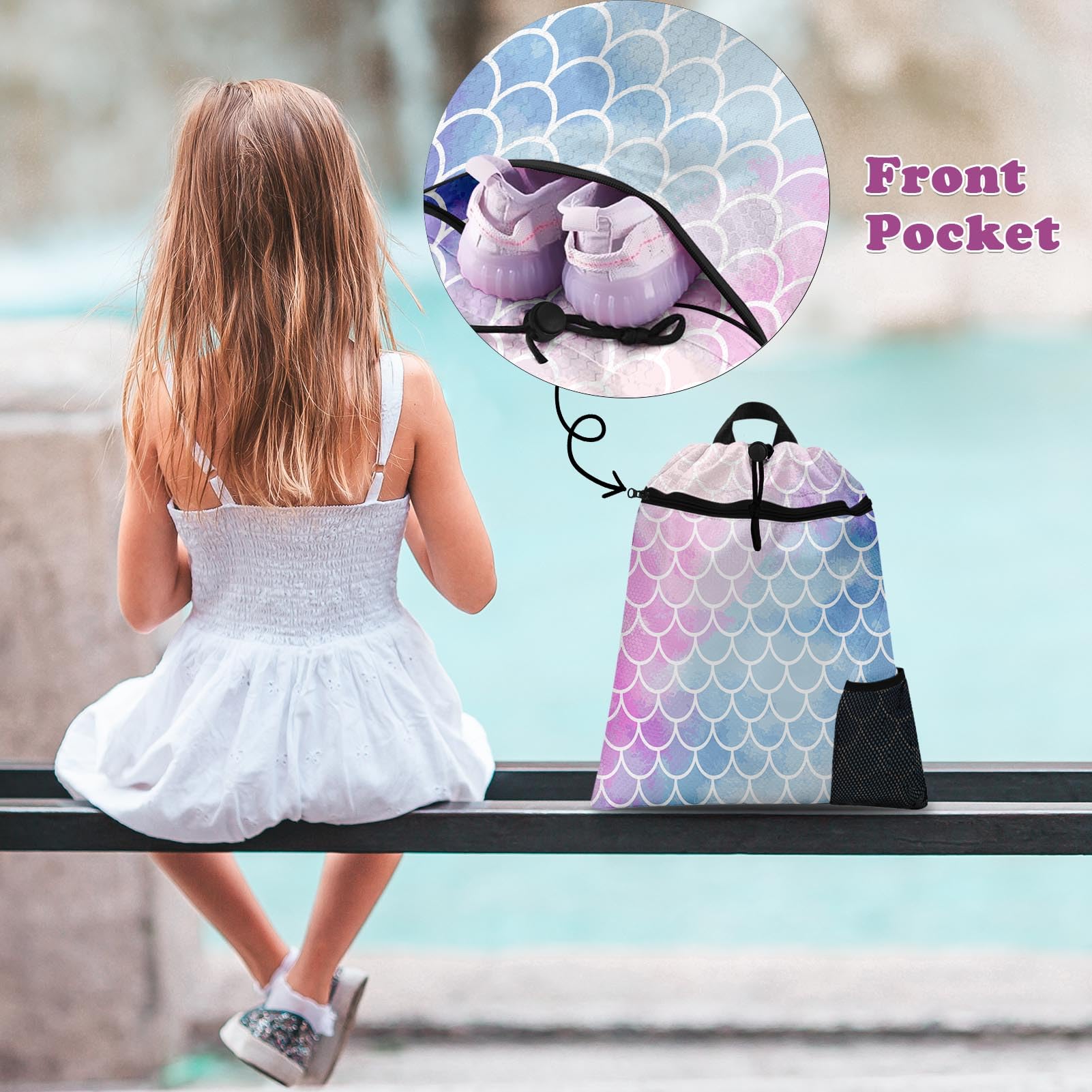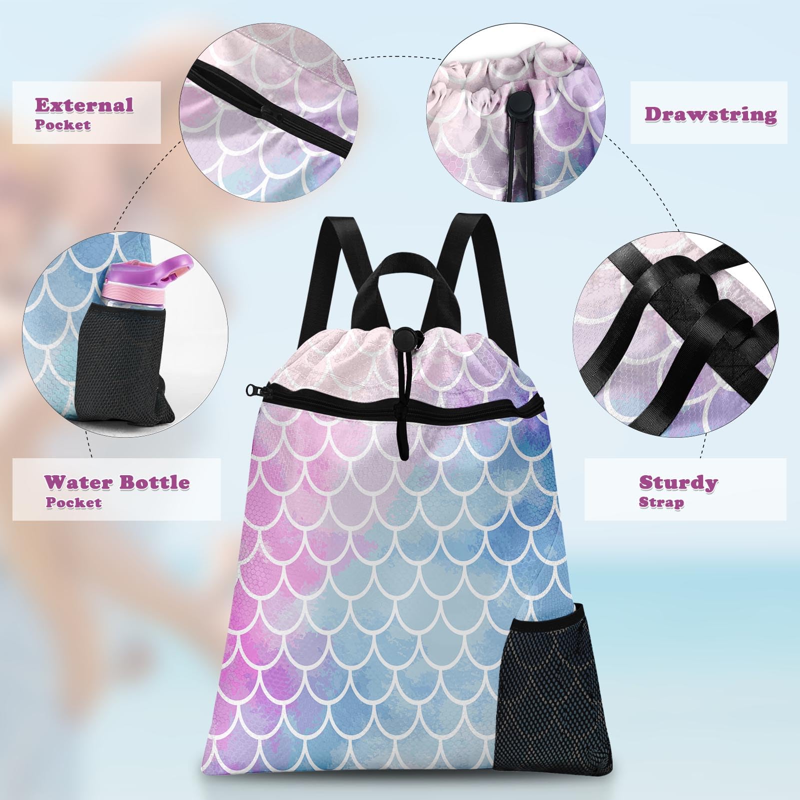 Britown Mermaid Gym Drawstring Backpack Waterproof Underwater Sea Pink Blue Girl Swimming Beach Sackpack, Sports Yoga Dance Travel String Bag Gift Bags with Water Bottle Pocket