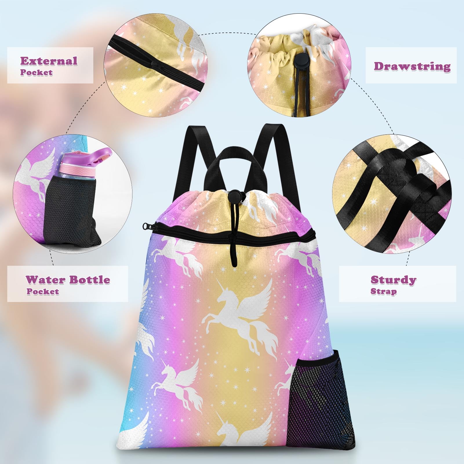 Britown Unicorn Starry Rainbow Gym Drawstring Backpack Waterproof Cute Love Girl Swimming Beach Sackpack, Sports Yoga Dance Travel String Bag Birthday Gift Bags with Water Bottle Pocket