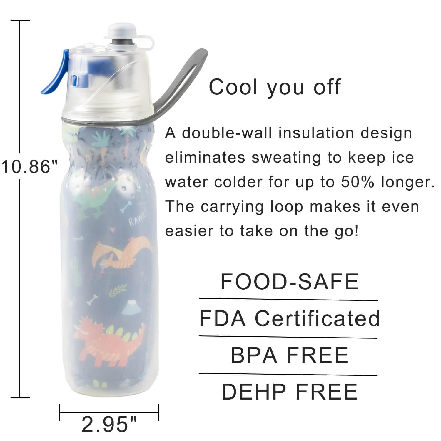 - 2-IN-1 Function Help You Cool Down Quickly: It's hot and sweats a good bit while doing sports, so grab some ice cold water to drink and mist your face with our double wall insulated mist n sip water bottles rather then getting soaked by pouring it on your head. By adding ice cubes to the insulated water bottle, it can keed ice cold for 5 hours, you can enjoy your exercise with it.