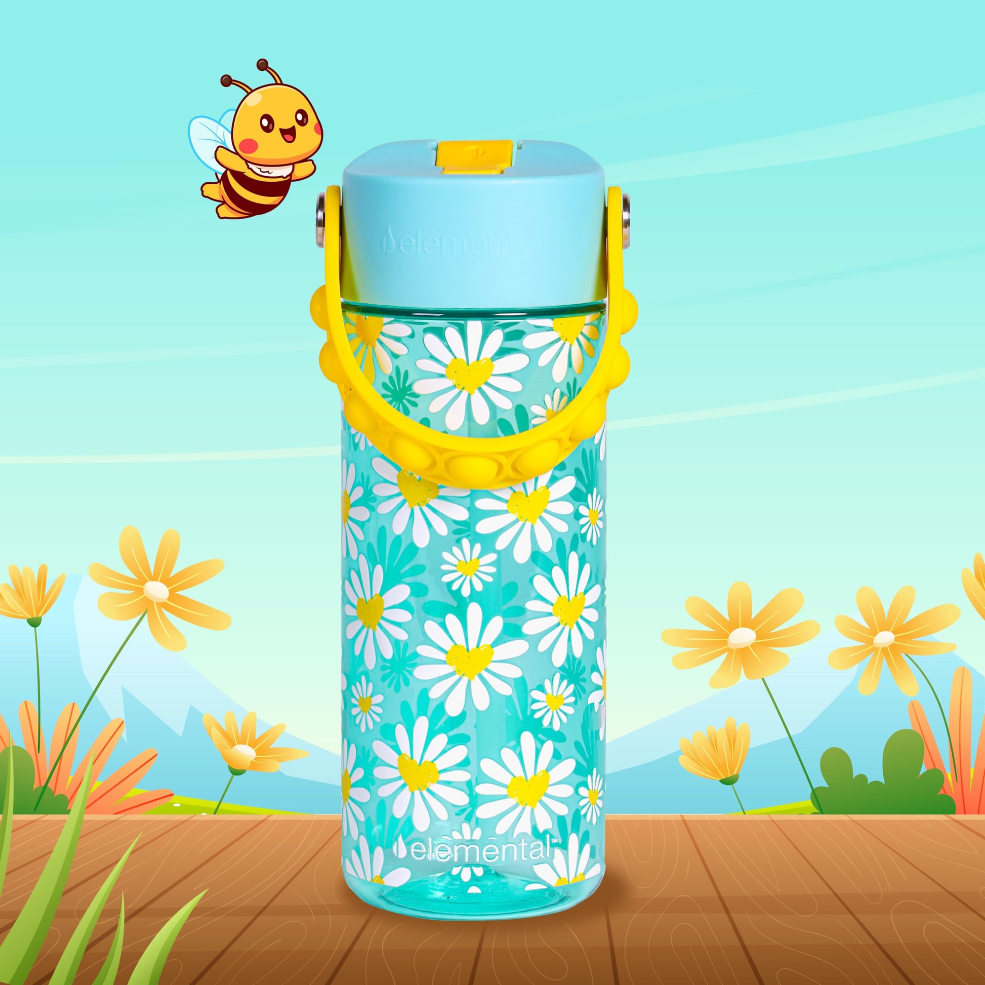 Elemental Leak Proof Water Bottles for Kids - Splash Kids Water Bottle for School with Fun Fidget Pop-it Handle - BPA Free Tritan Plastic Reusable Water Bottle with Straw - Daisy Heart - 18oz
