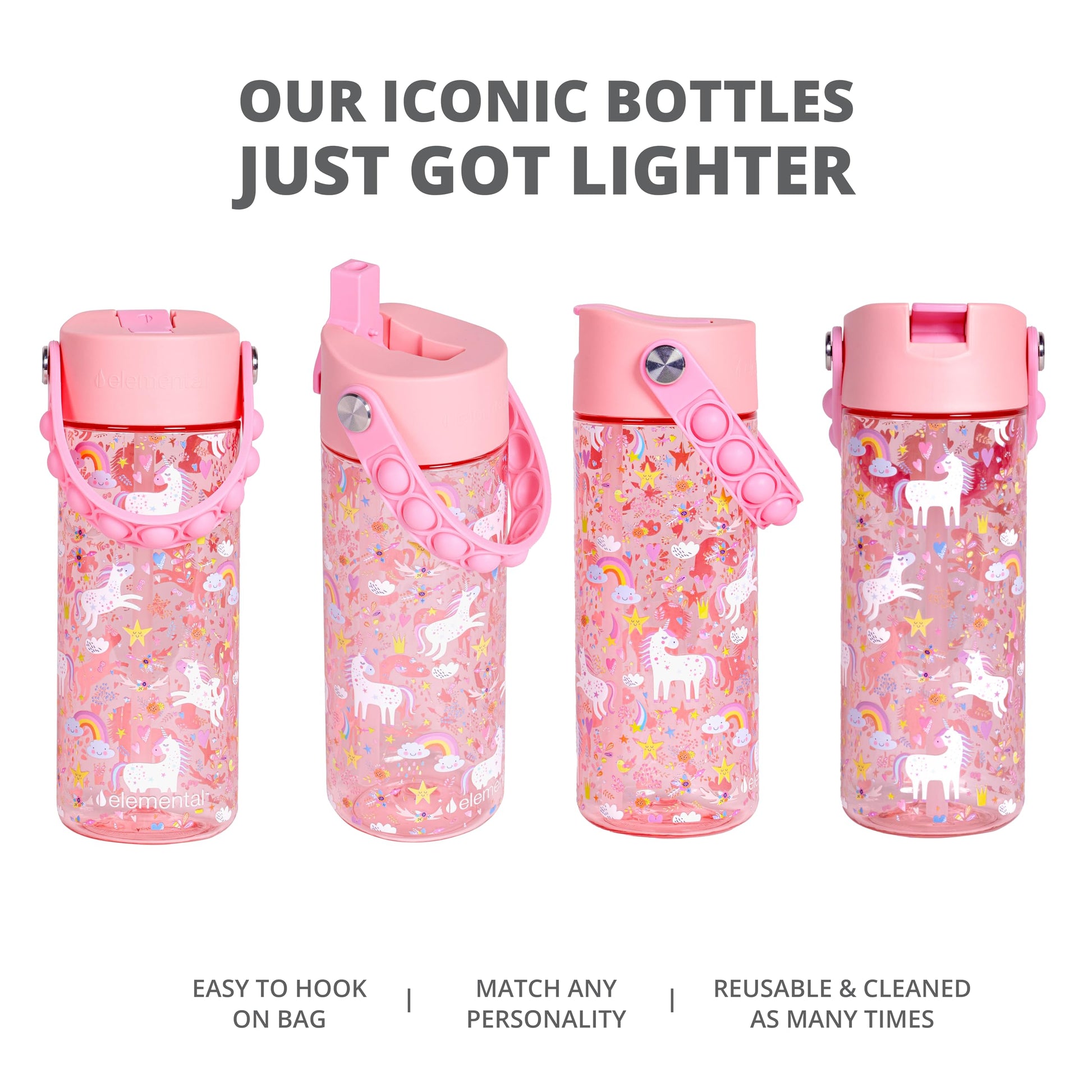 Elemental Leak Proof Water Bottles for Kids - Splash Kids Water Bottle for School with Fun Fidget Pop-it Handle - BPA Free Tritan Plastic Reusable Water Bottle with Straw - Pink Unicorn - 18oz