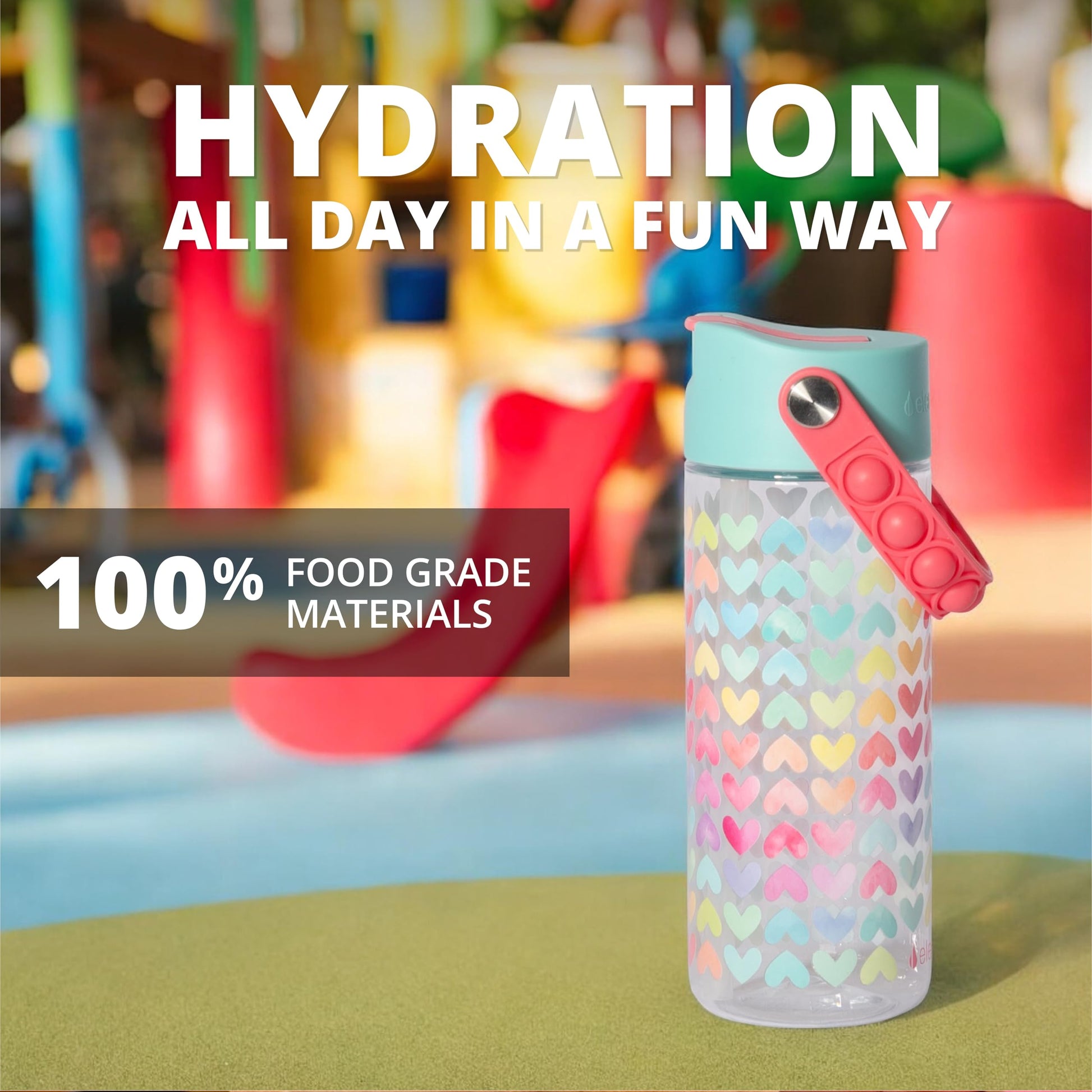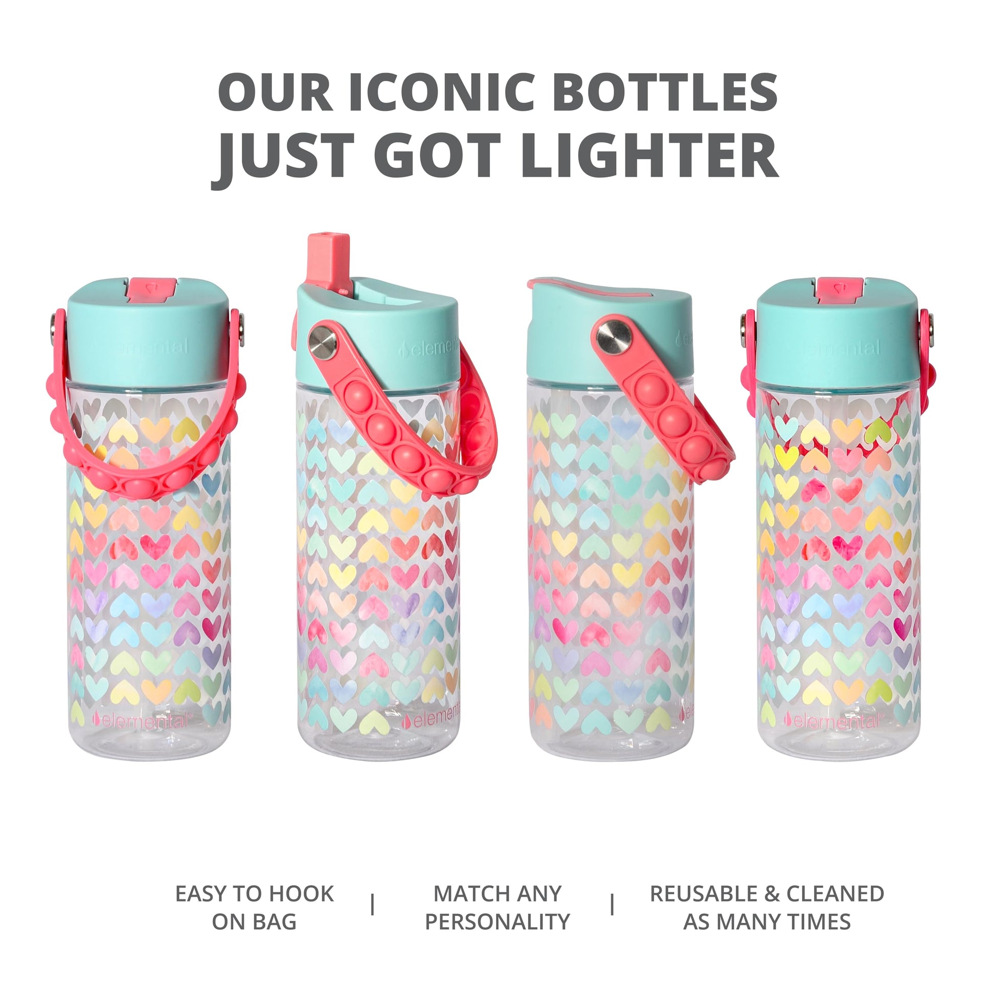 Elemental Leak Proof Water Bottles for Kids - Splash Kids Water Bottle for School with Fun Fidget Pop-it Handle - BPA Free Tritan Plastic Reusable Water Bottle with Straw - Rainbow Heart - 18oz