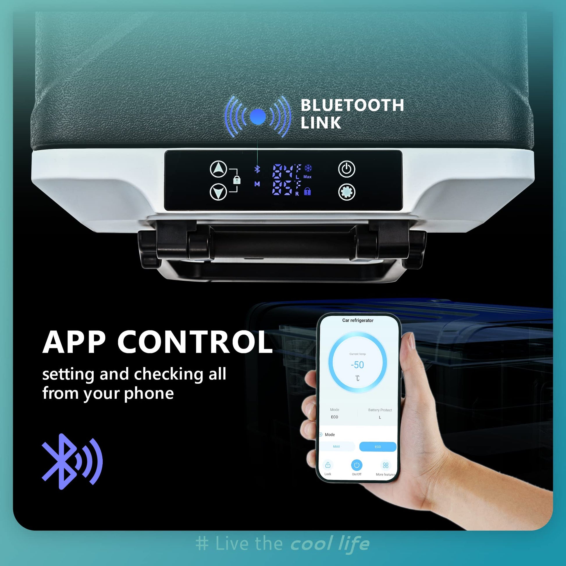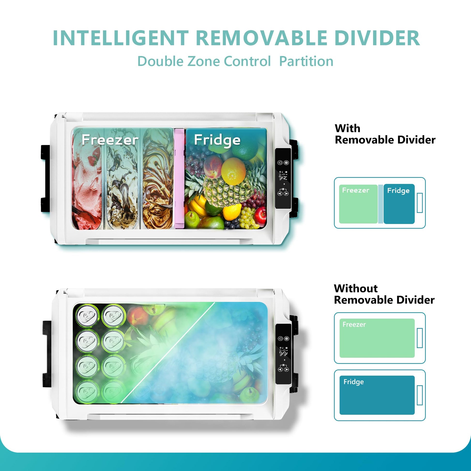 - Two Zones & App Control; The portable refrigerator is designed with two zones to effectively reduce odor. The portable freezer features a removable divider for easy storage and access. With a large 58Quart capacity, it can store all your essentials. The Bluetooth mode and enabled APP control allow you to control the 12v cooler remotely, adding much convenience to your journey