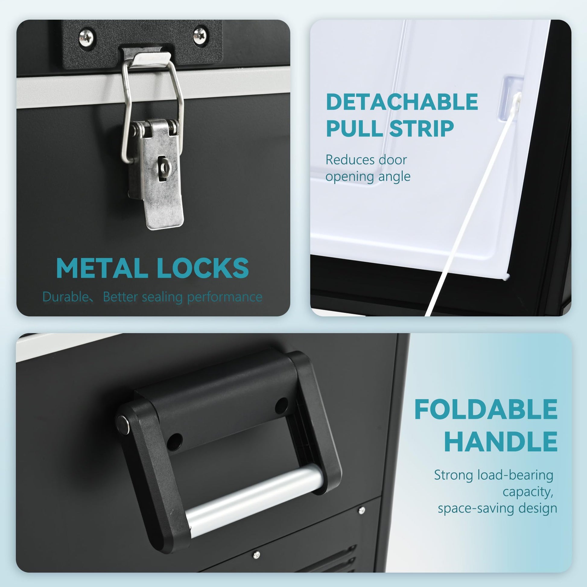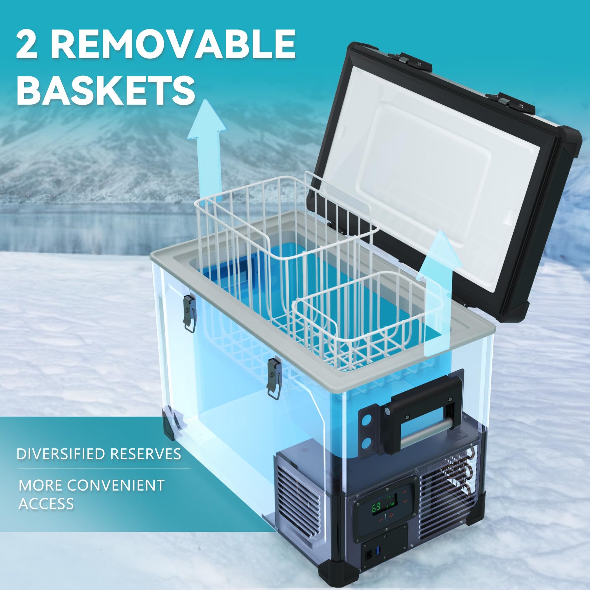 - Door Locks & User-friendly Design: The car freezer with metal door locks are more durable and better sealing. The portable freezers features two removable internal baskets for easy storage and access. The removable door handle allows you to open the door at a reduced angle, making it easier for you to travel