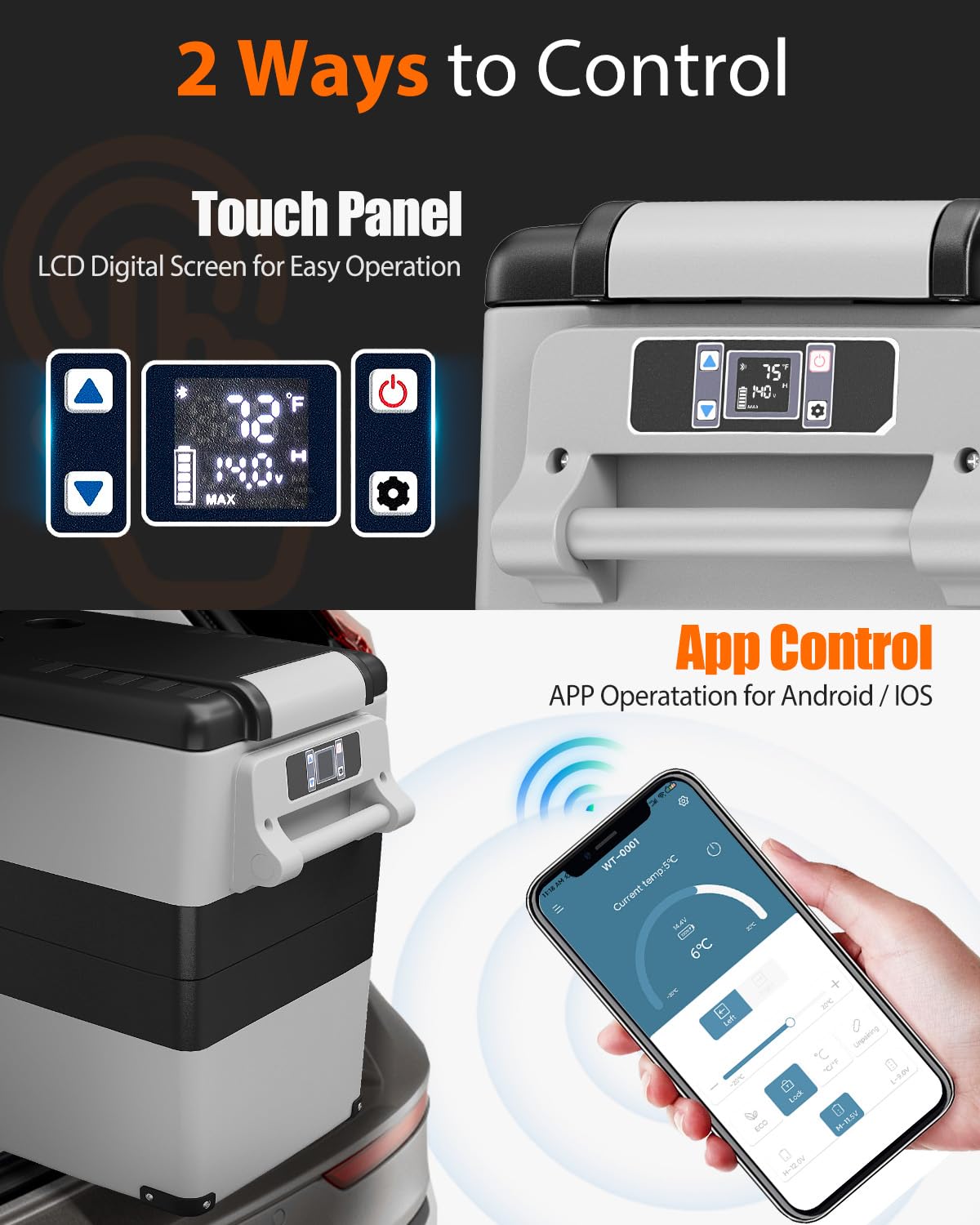 - 【Designed for Portability】- Take your portable fridge wherever you go with the ergonomic handle and durable design, capable of stable operation even at a 30-degree incline. The sleek, gray exterior not only looks good but is built to last, making it perfect for outdoor enthusiasts and travelers. In addition, our user-friendly LCD touch panel and remote Bluetooth control offer you the luxury of adjusting temperatures, ensuring that your items are perfectly preserved.