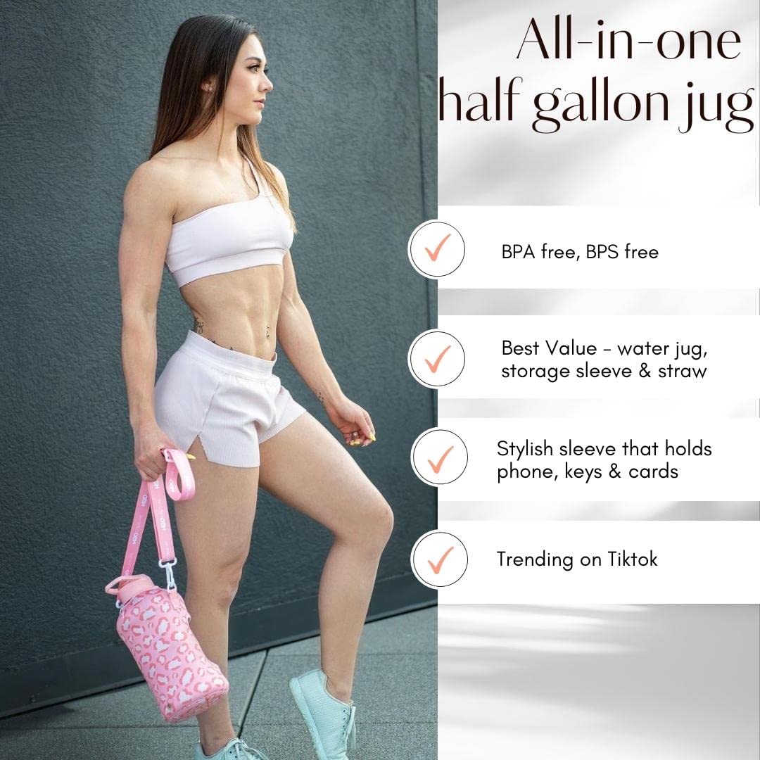 - HALF GALLON HYDRATION WITH COVERED STRAW LID: The extra large pink 2.2L / 74 oz plastic jug holds all the water you need to stay hydrated while you exercise. The reusable half gallon comes with a leak-proof & dust-proof covered straw lid, which helps protect the mouthpiece and flips open with a click of a button. The straw-lid is air-sealed: Run straw brush through mouth piece before initial use. The H2O Capsule bottle with storage sleeve comes with a bonus straw cleaning brush.