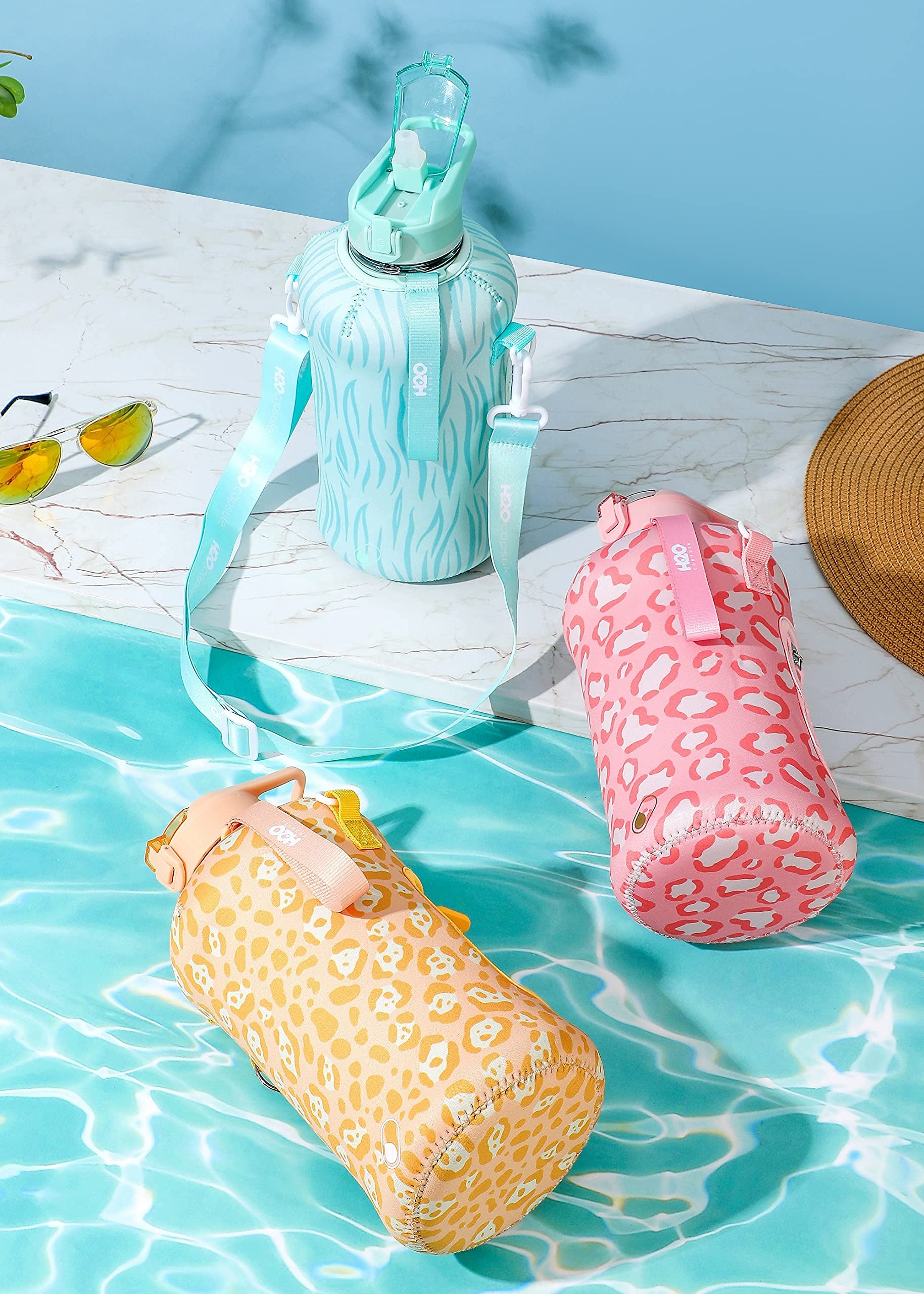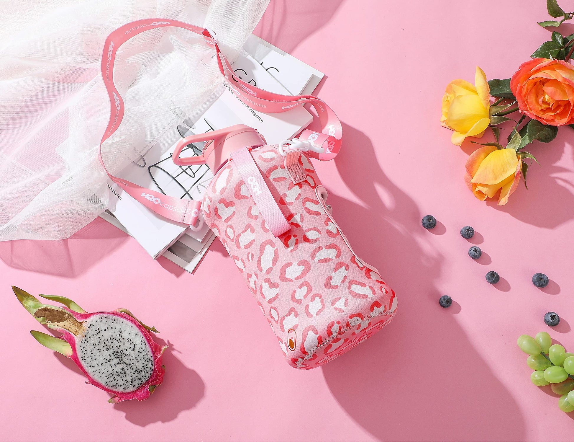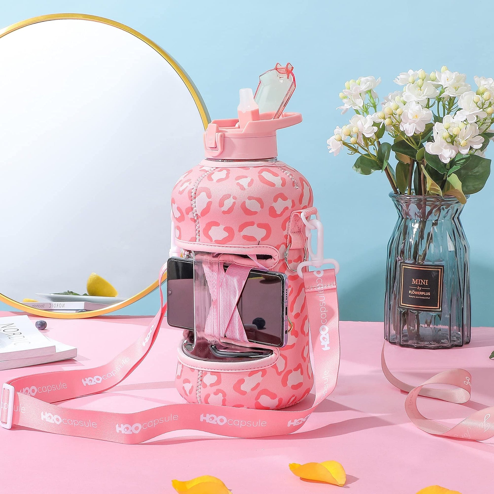 H2O Capsule 2.2L Half Gallon Water Bottle with Storage Sleeve and Covered Straw Lid – BPA Free Large Reusable Drink Container with Handle - Big Sports Jug, 2.2 Liter (74 Ounce) Pink Leopard