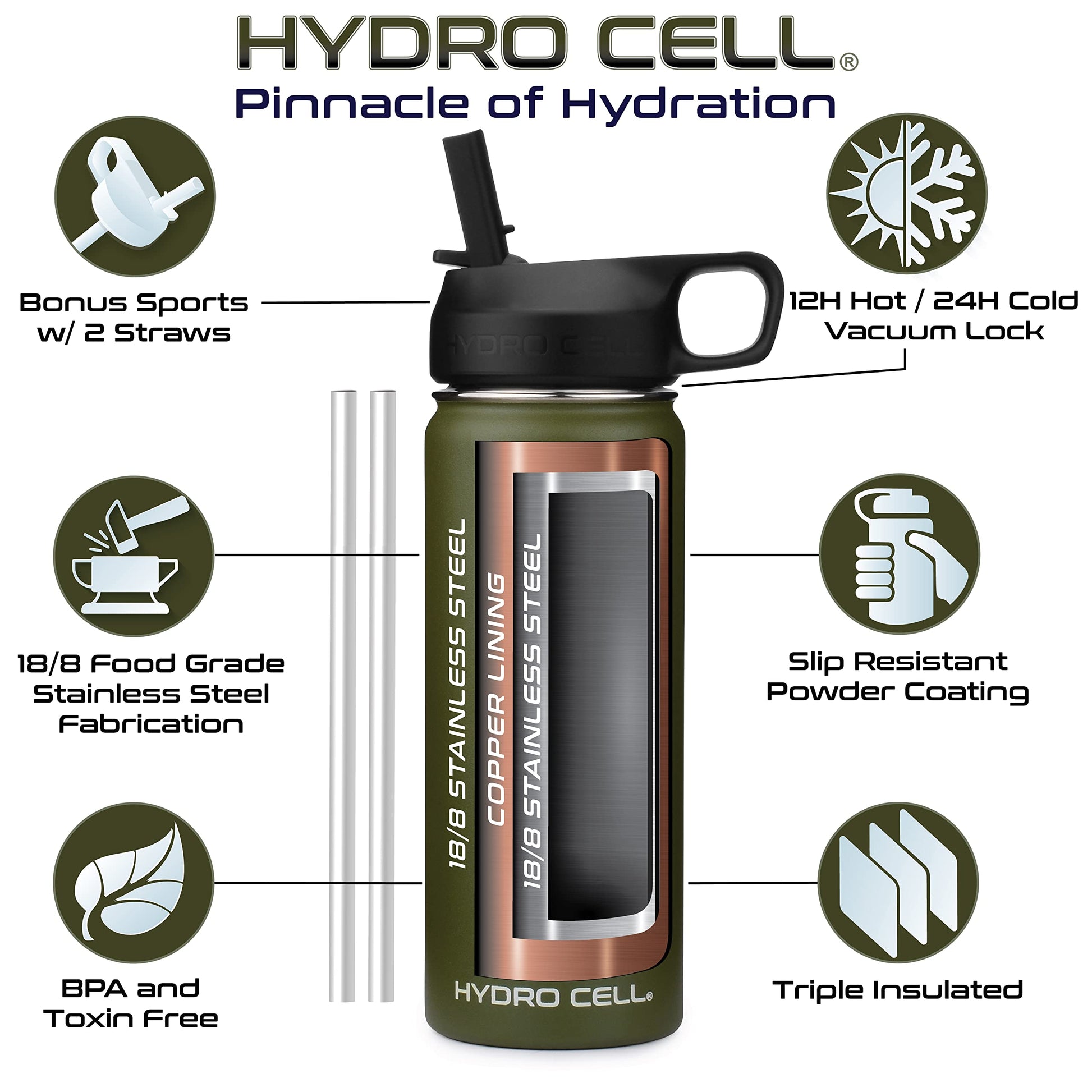 HYDRO CELL Stainless Steel Insulated Water Bottle with Straw - For Cold & Hot Drinks - Metal Vacuum Flask with Screw Cap and Modern Leakproof Sport Thermos for Kids & Adults (Army 18oz)