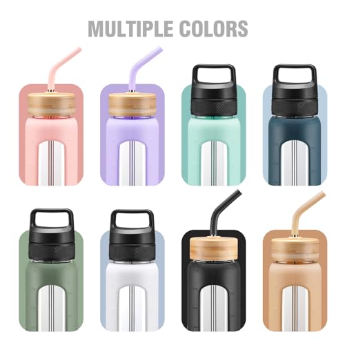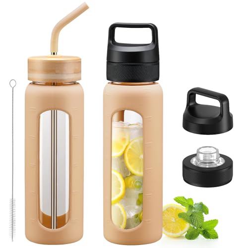 - WHAT YOU'LL GET - Our waterbottle set comes with a glass water bottle covered with a silicone protective sleeve, 1 bamboo lid and 1 chug lid with top handle, 1 stainless steel straw, and 1 straw cleaning brush. With its eco-friendly design, practicality, and stylish appearance, the reusable water bottle makes for a great gift option for friends, family, or colleagues who value sustainability and quality in their daily essentials.
