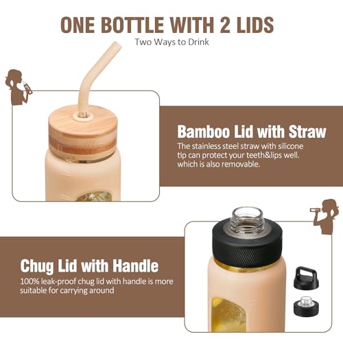 - 2 LIDS WATER BOTTLE - The inclusion of both a chug lid and a bamboo straw lid offers versatile drinking options for different preferences. You can easily switch between the lids depending on your needs. Whether for water, juice, smoothies, or other beverages, the glass water bottle with dual lids is ideal for various drink options. Chug lid provides easy access for quick hydration on the go, workouts, hikes or daily commutes. The bamboo straw lid offers a stylish way to sip drinks slowly.