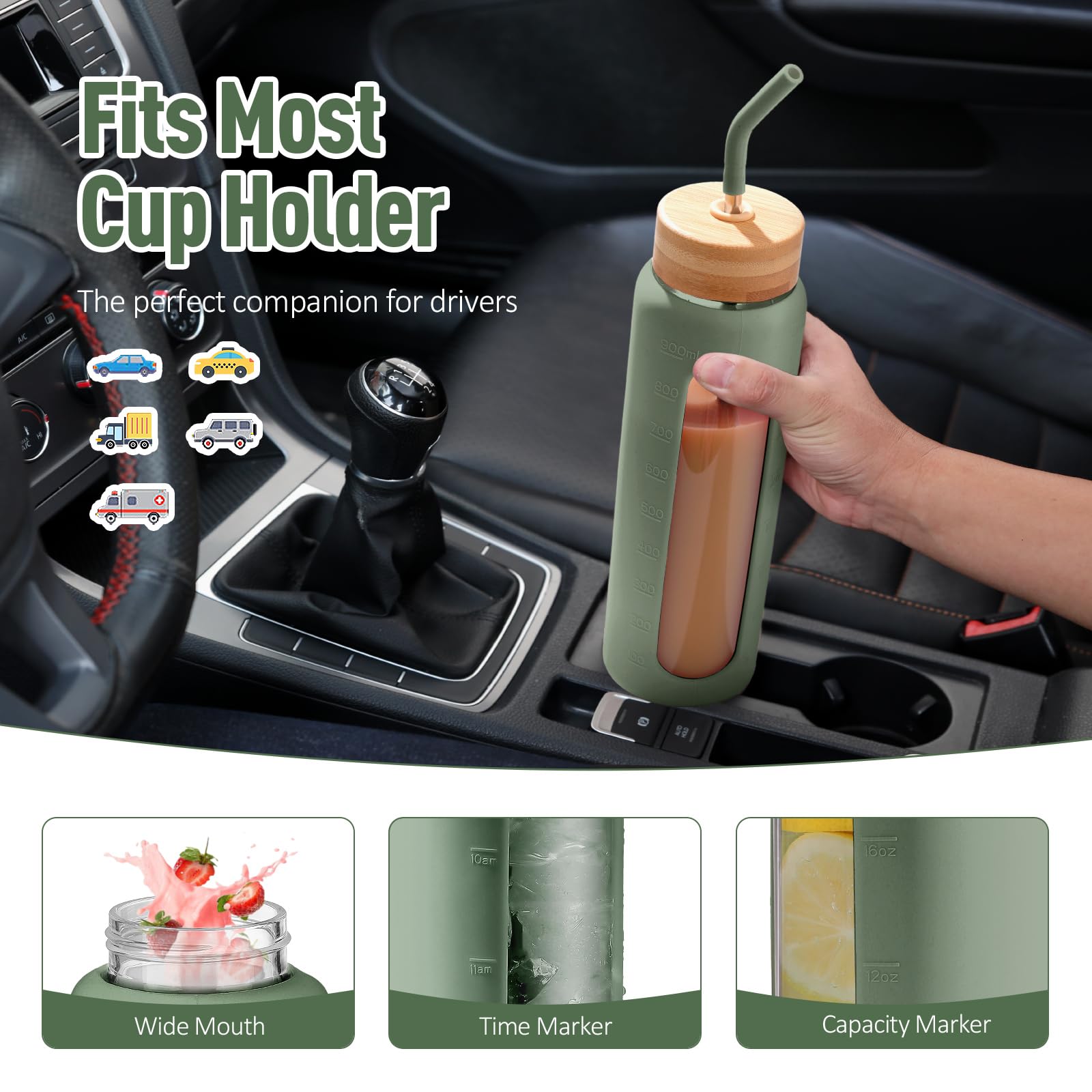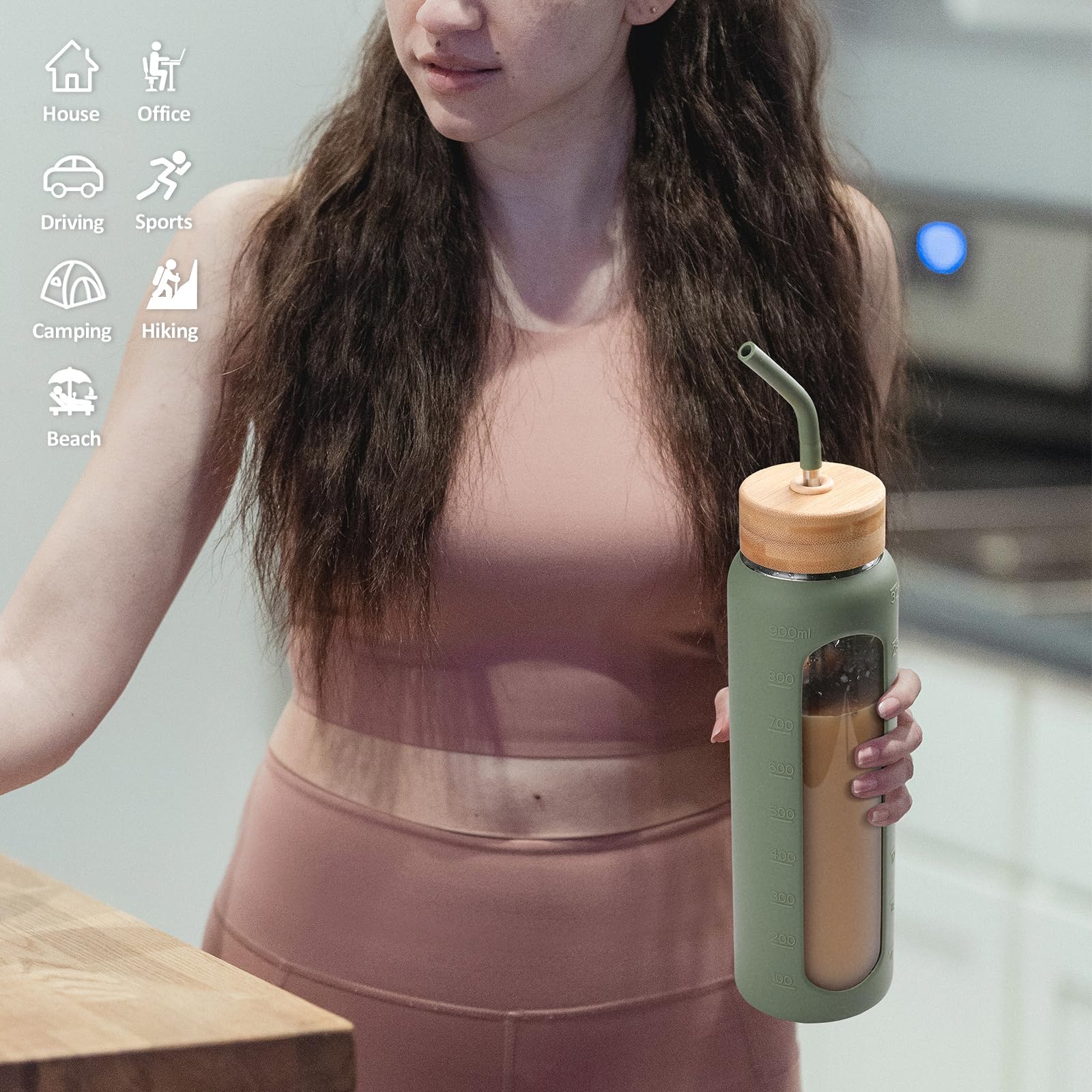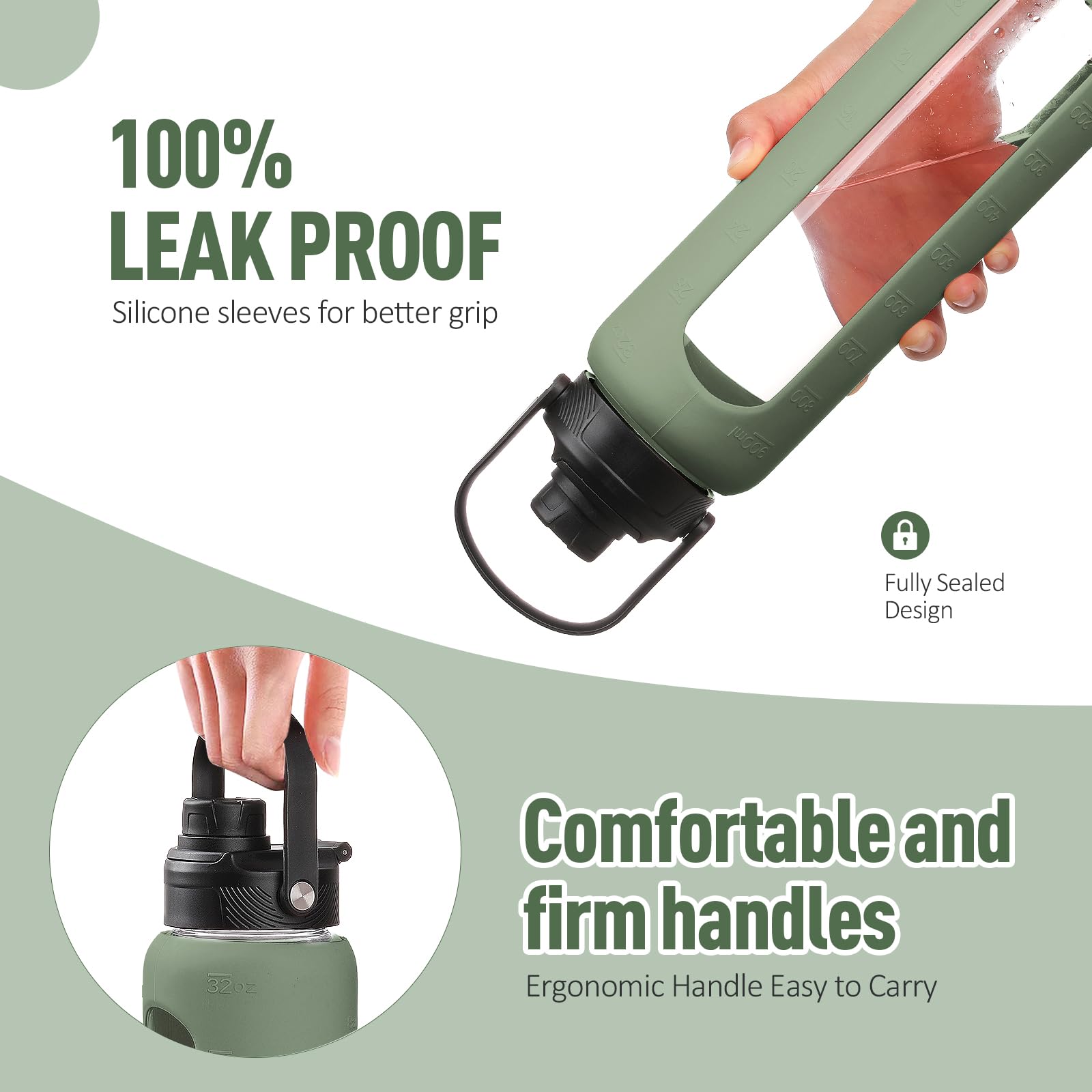 Kodrine Glass Water Bottles 32 oz Water Bottle with Straw, Sports Water Bottle with Handle, Clear Water Bottle with 2 lids Bamboo Lid and Spout Lid, Wide Mouth Water Bottle with Sleeve, Olive
