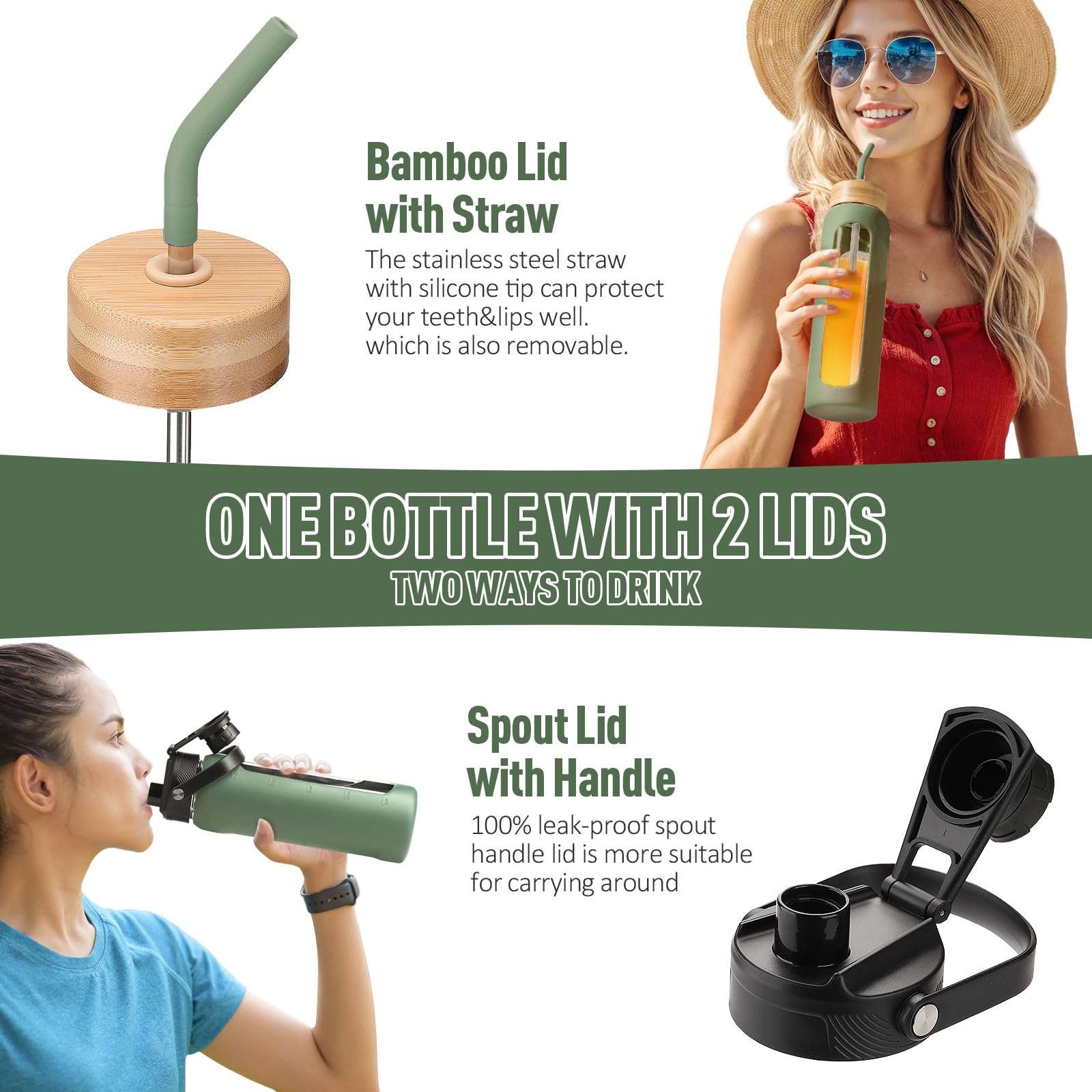 - DUAL LID WATER BOTTLE - Our glass water bottle is equipped with 2 lids, offering a range of options for drinking and transport. The bamboo straw lid makes sipping more effortless, allowing for easy hydration throughout the day whether you're at the home, office, gym, or outdoor activities. The leak-proof spout lid is designed for those who prefer a more traditional drinking habit. The spout enables smooth liquid flow and the handle attached to the lid allows for easy carrying on the go.