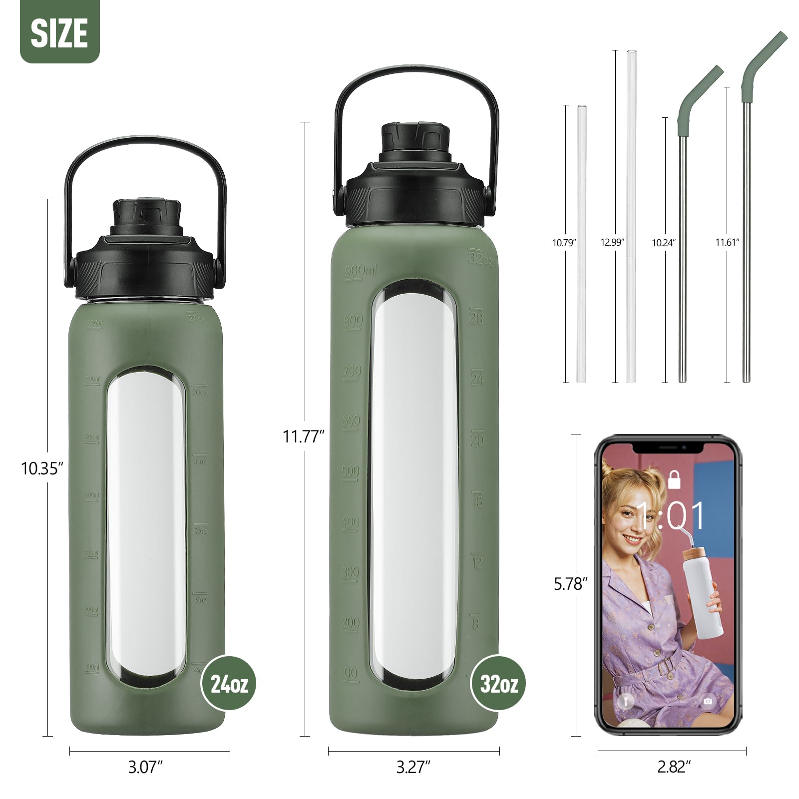 - 24 OZ AND 32 OZ VOLUME FOR OPTIONS - We have 2 sizes for those glass drinking bottles. The 32 oz glass water bottles are perfect for those who require a larger volume of water throughout the day. With this 32 oz bottle(1 liter water bottle), you can stay hydrated without the need for frequent refills. For those seeking a slightly smaller option, we offer the 24 oz glass water bottle, which is ideal for individuals who prefer a more compact and lightweight bottle.