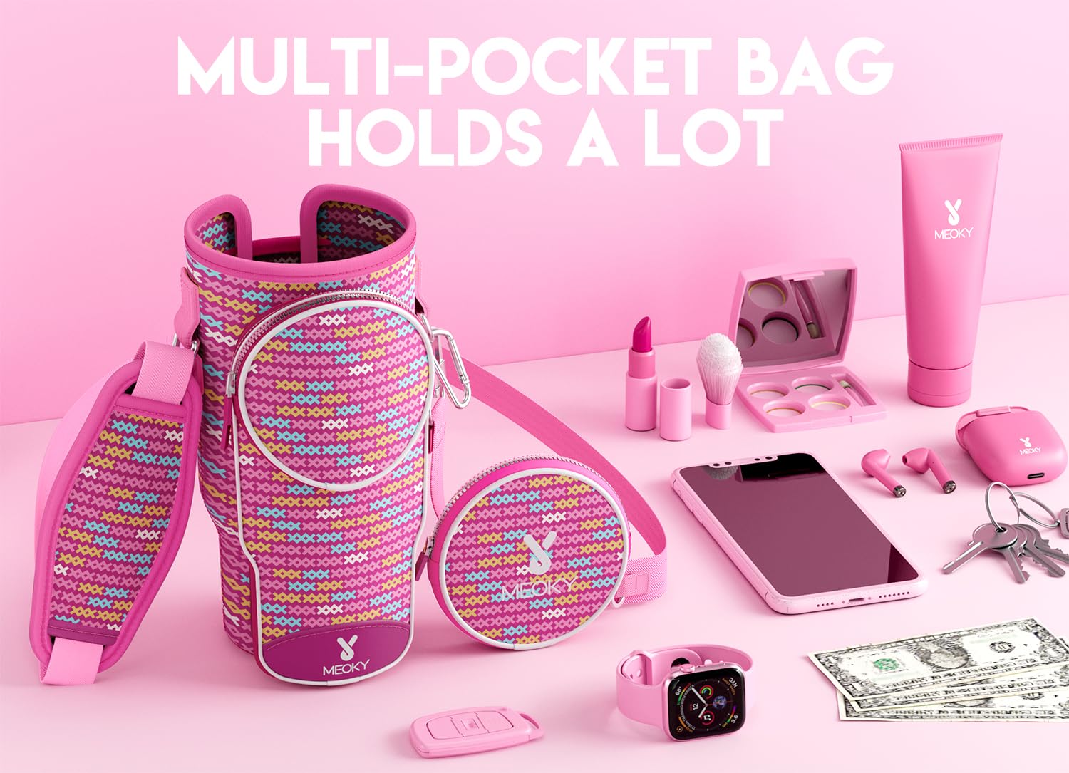 - MULTIPLE POCKETS. Meoky water bottle carrier bag comes with 3 zippered pockets, including 1 large phone pocket, 1 front pouch and 1 extra pocket for storing smartphones, cash, cards, keys, and more.