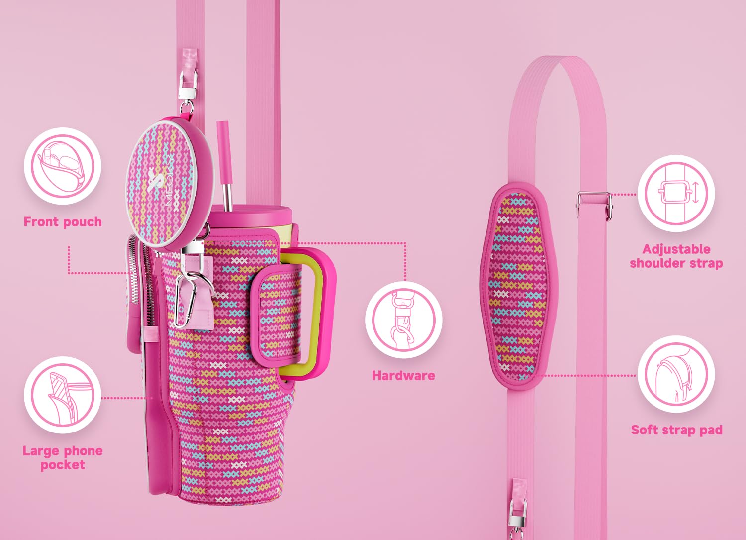 Details: Meoky Water Bottle Carrier Bag with Phone Pocket for 40 oz Tumbler with Handle, Neoprene Water Bottle Holder Pouch with Adjustable Strap, 2 Carabiner Clips (Cheer)