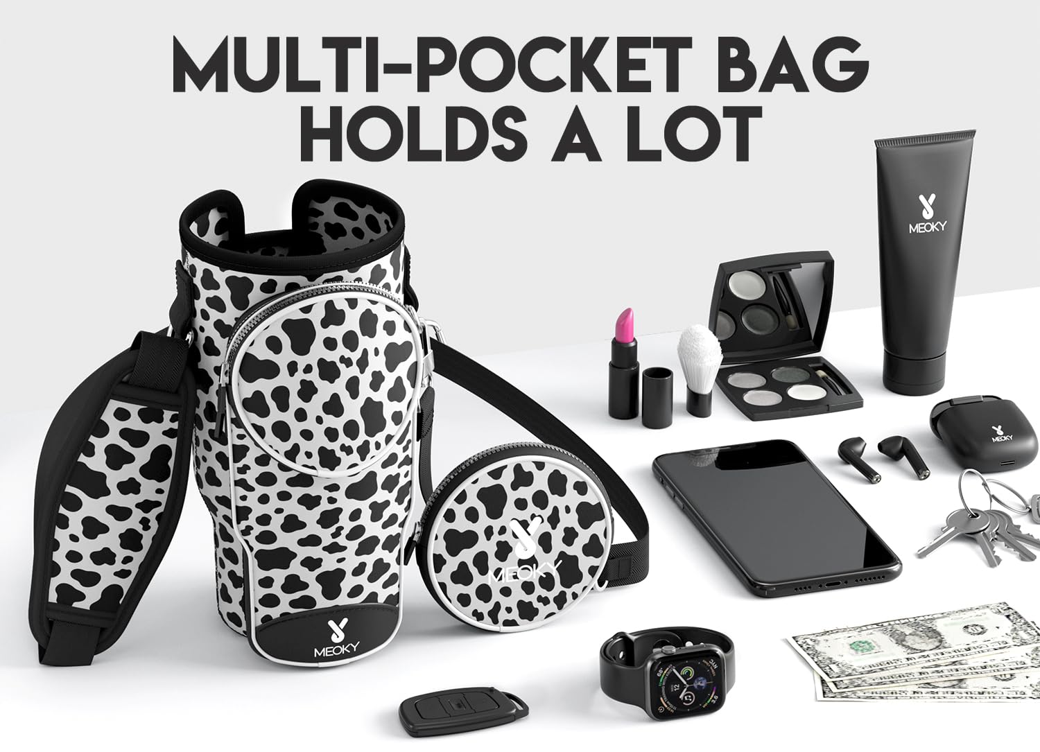 - MULTIPLE POCKETS. Meoky water bottle carrier bag comes with 3 zippered pockets, including 1 large phone pocket, 1 front pouch and 1 extra pocket for storing smartphones, cash, cards, keys, and more.