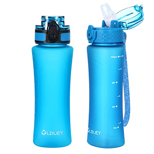 OLDLEY Kids Water Bottle for School with Straw Chug Lid, 15 oz Unbreakable Leak-Proof BPA-Free Motivational Water Bottles with Time Marker for Travel Sports Gym, 2 Lids, Blue