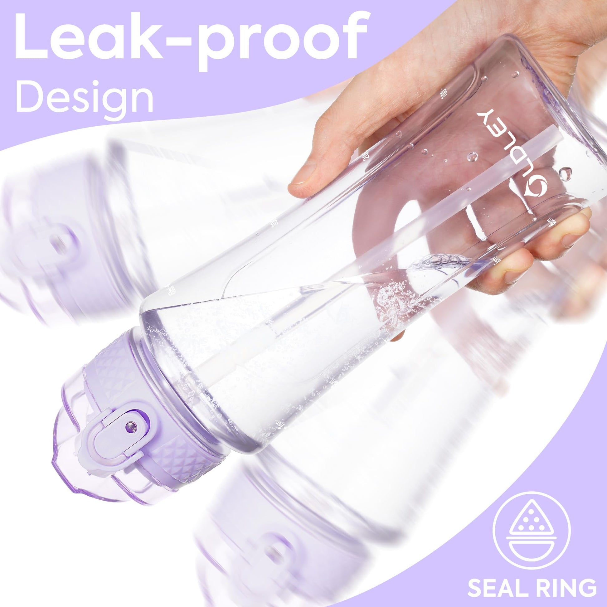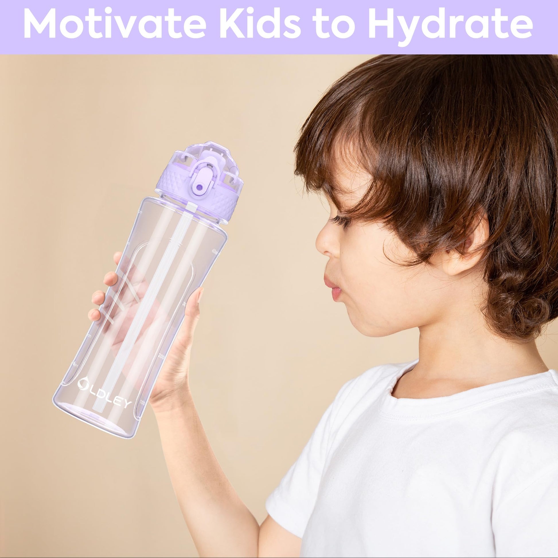 OLDLEY Kids Water Bottle with Straw 15 oz BPA-Free Leak-Proof Motivational Water Bottles with Time Marker for School Sports Travel Gym, Easy to Use for Girls Goys, 1 Straw Lid, Transparent-purple