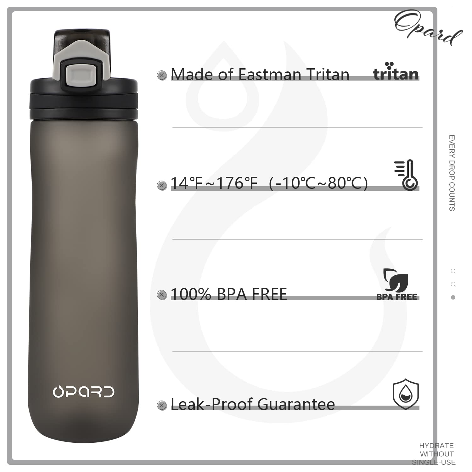 Opard Peak Water Bottle 20 Oz BPA Free Tritan Plastic Leak Proof Flip Top for School Kids Sports Gym Yoga Camping (Dark Grey)