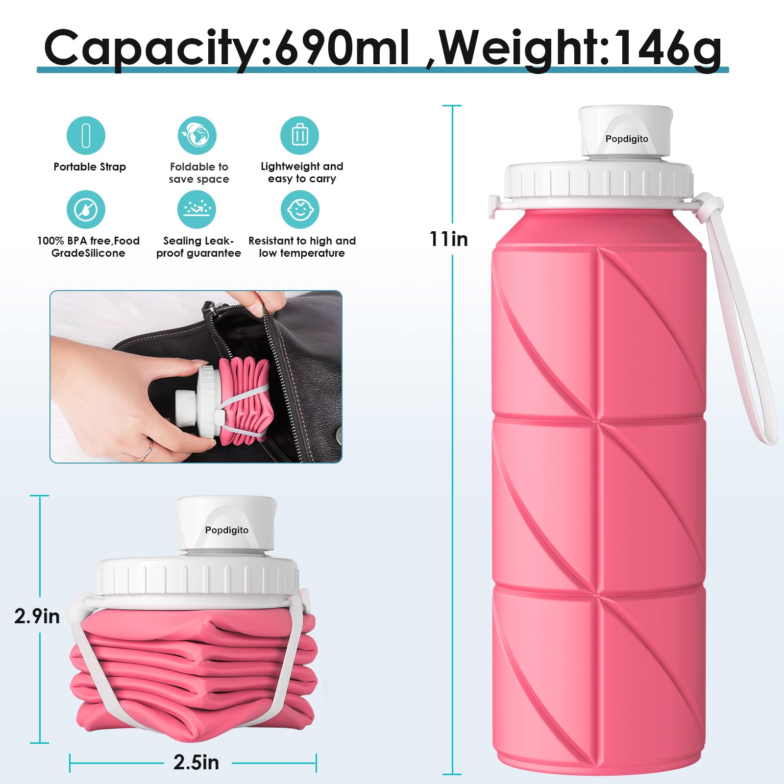 - The Collapsible water bottles 23.3oz(690mL) portable silicone bottle is a foldable type. , from small pocket-sized bottles to larger ones that can hold up to 23 ounces of water.Its folded size is 2.9in(Height)*2.6in(Width) and capacity is 610ML.Many of them also feature a built-in straps, making it ideal for travel and easy to attach them to a backpack or belt loop for hands-free carrying.