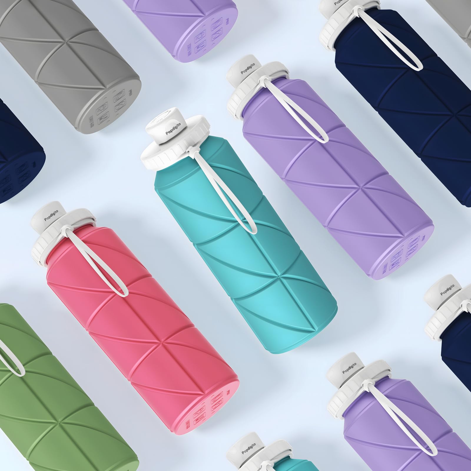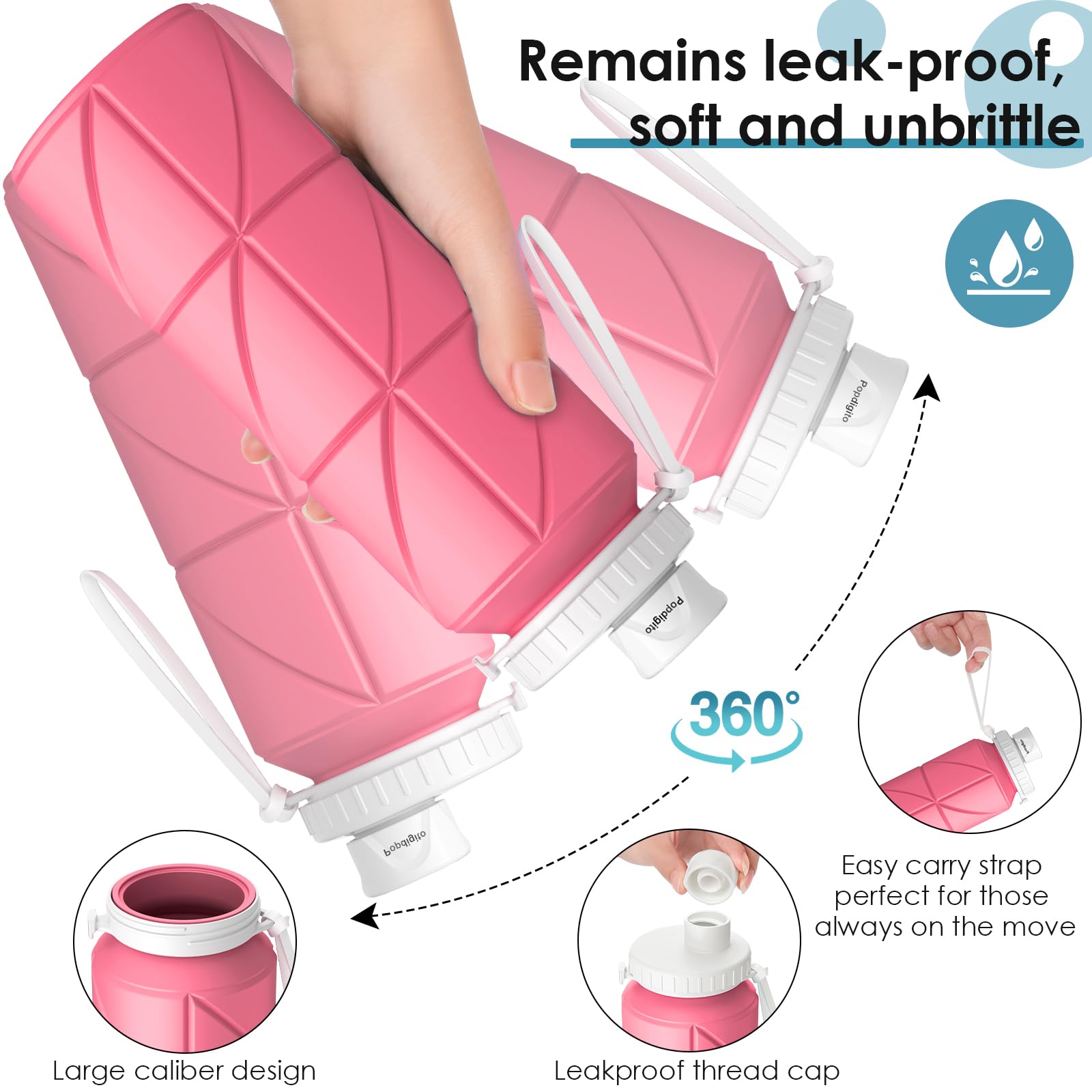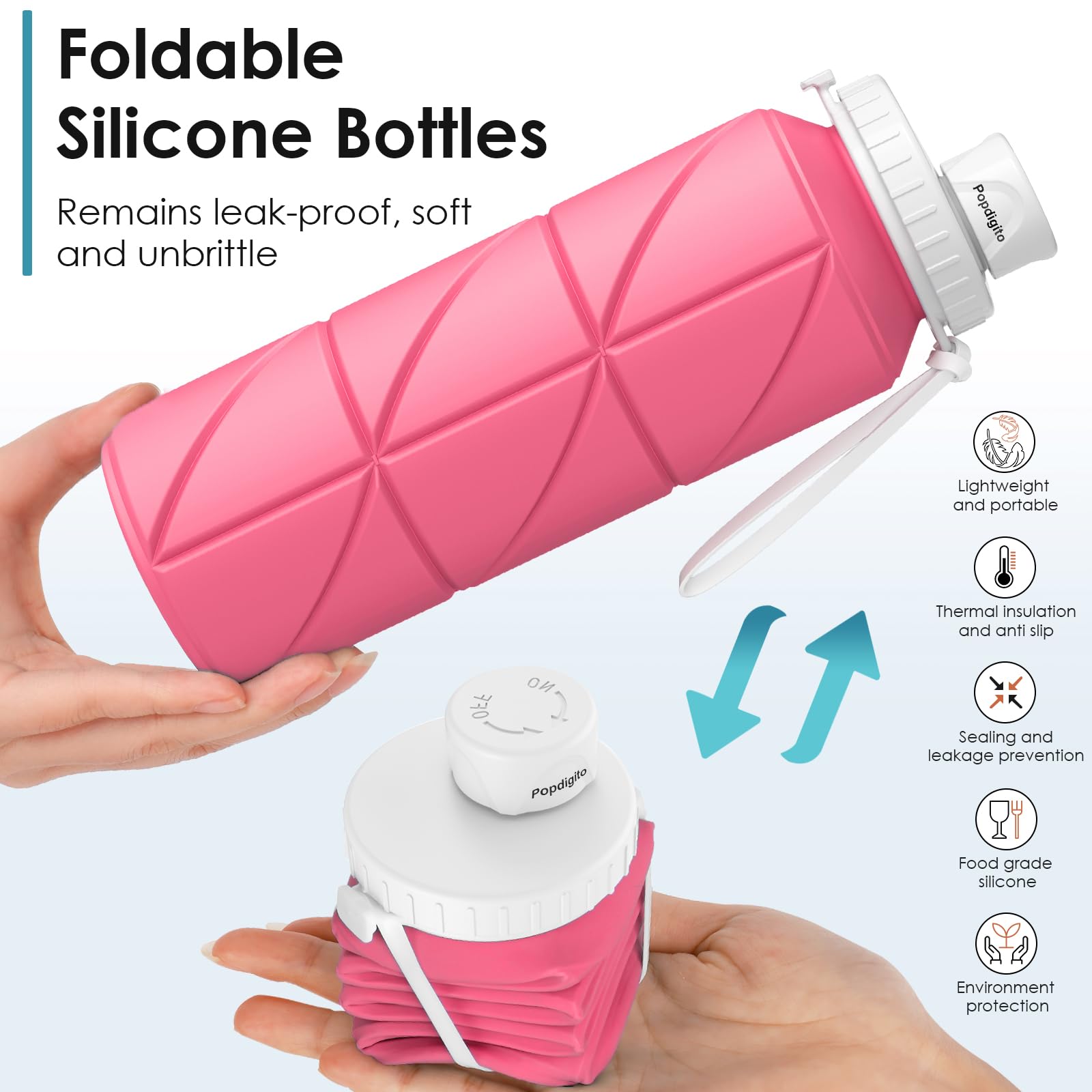 - Popdigito Collapsibe Water Bottles With Leakproof Lids:The travel water bottle designed with silicone seal ring to prevent leakage.The patented sealing screw cap is used to eliminate splashing and effectively prevent the bottle from accidentally opening.The wide-mouth design makes it easier to clean the inside of the collapsible soft water container or add ice or lemon to it. When using for the first time,it is recommended to soak in boiling water for 10 minutes for thorough cleaning.