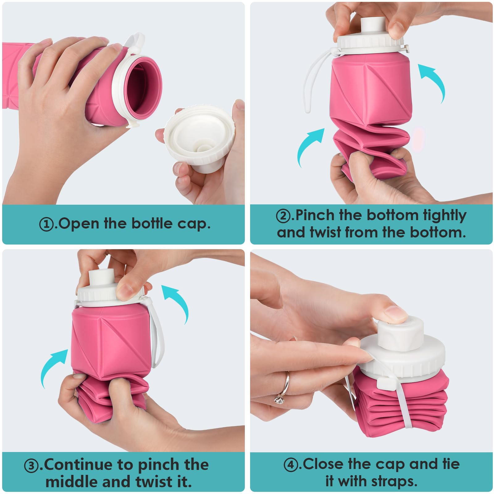 - Portable Convenience: Usage steps:1)Open the bottle cap.2)Pinch the bottom tightlyand twist from the bottom.3)Continue to pinch themiddle and twist it.4)Close the cap and tieit with straps.Say goodbye to bulky, rigid water bottles! Our lightweight and compact collapsible water bottle is your brilliant choice. This versatile and reusable companion attaches effortlessly to your backpack or gym bag, keeping hydration within reach. It even fits neatly in your pocket, purse, or pack.