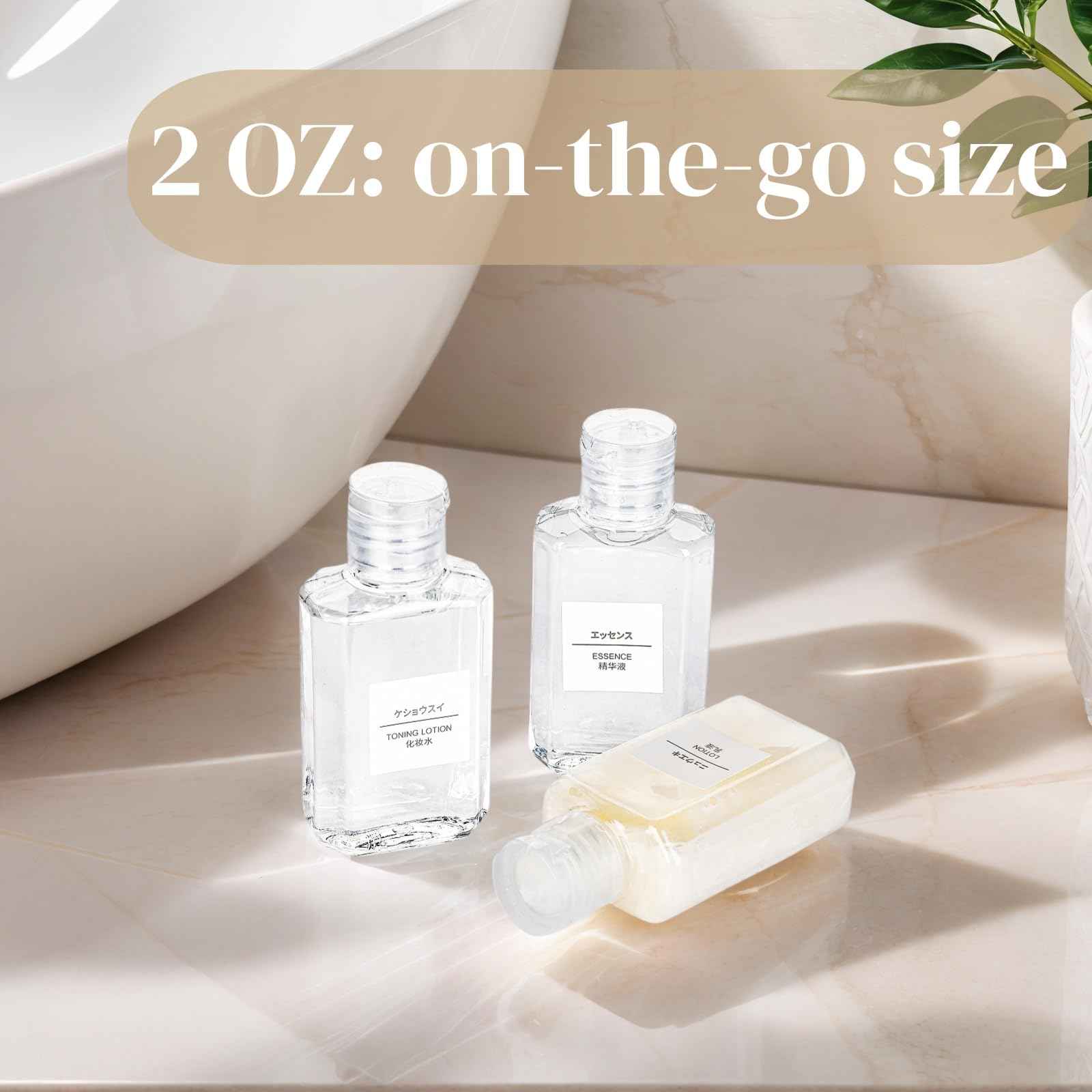 - Travel Bottles: These 2 oz mini travel containers are lightweight and has on-the-go size, easy to store in your bag. They are perfect for travel, business trip, vacation trip, outdoor activities, gym, etc.