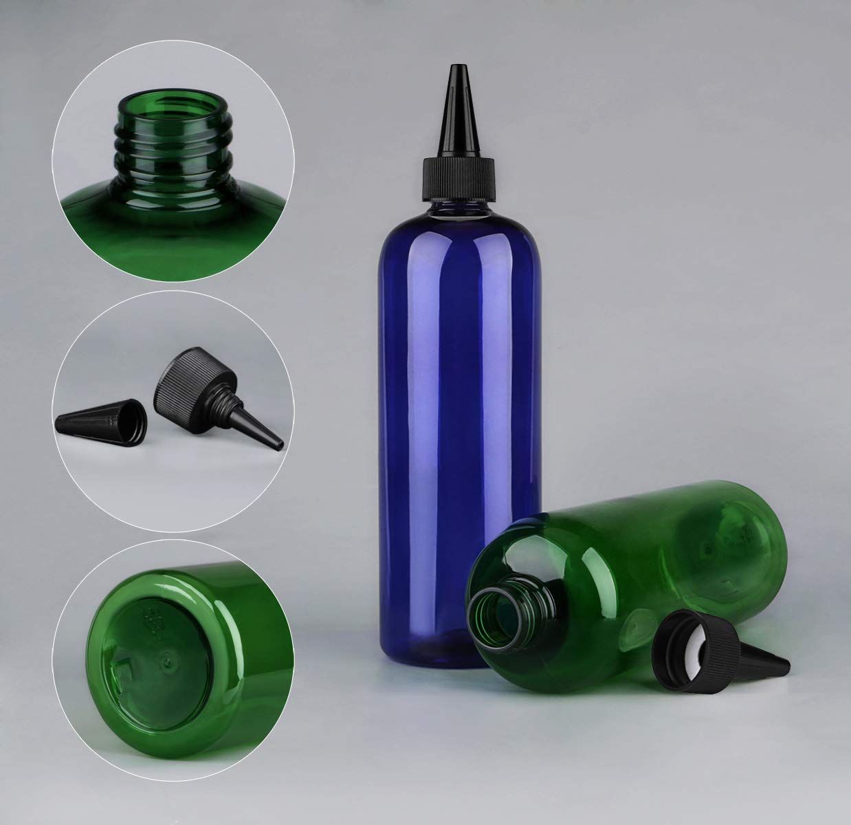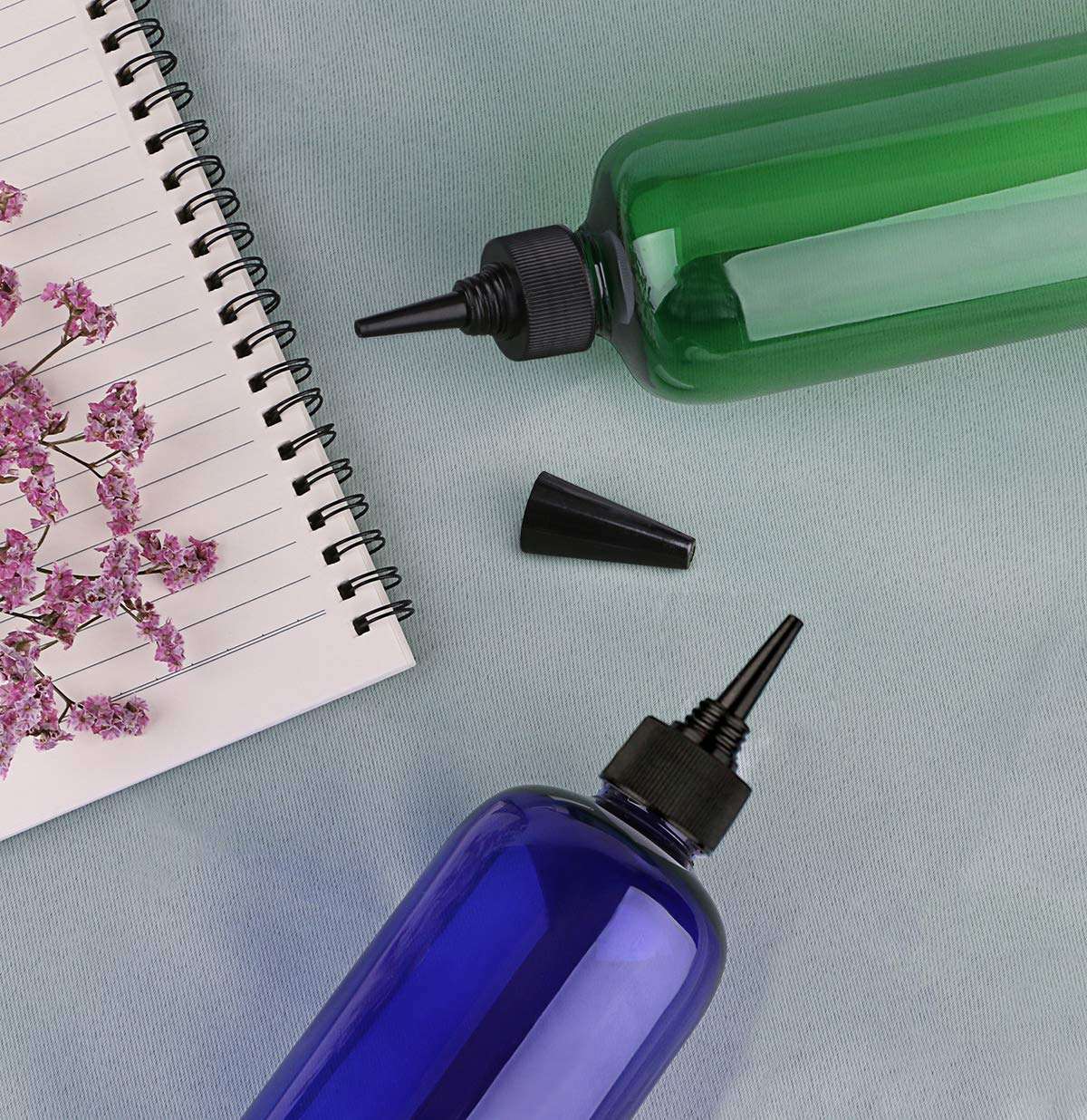 - Package included: Pack of 2 translucent plastic bottle with black tips and twist-on cone lids, 1 green and 1 blue. If there has any cap missing, please contact us and we will solve the issue for you
