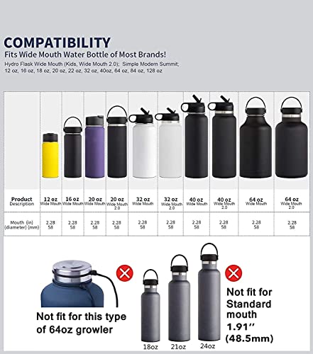 - Fit Most Wide Mouth Insulated Bottles Sizes 16 oz, 18 oz, 20 oz, 32 oz, 40 oz, and 64 oz., from brands such as Hydro Flask and Takeya and simple modern
