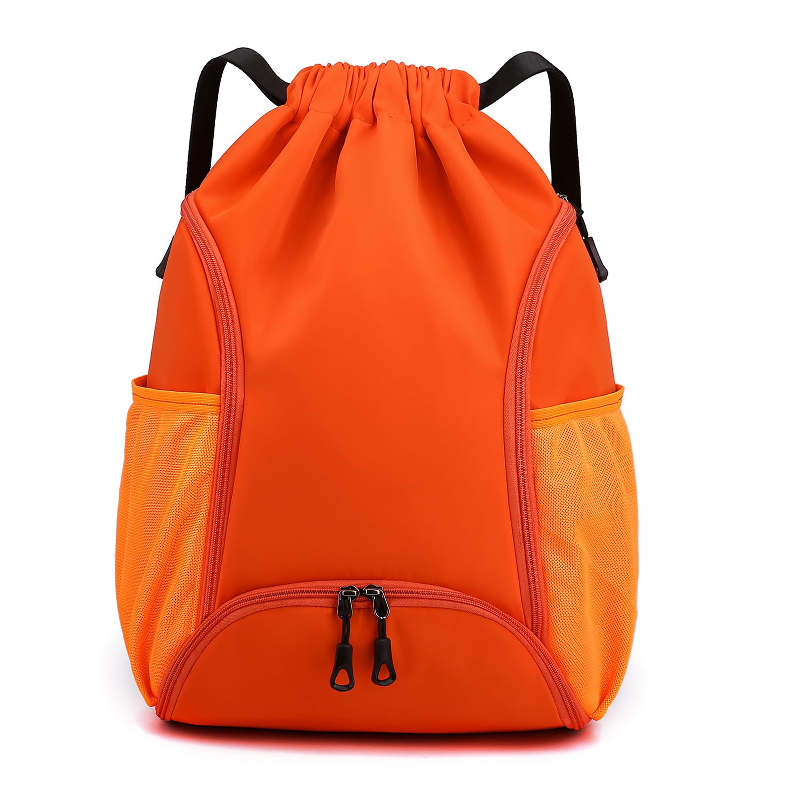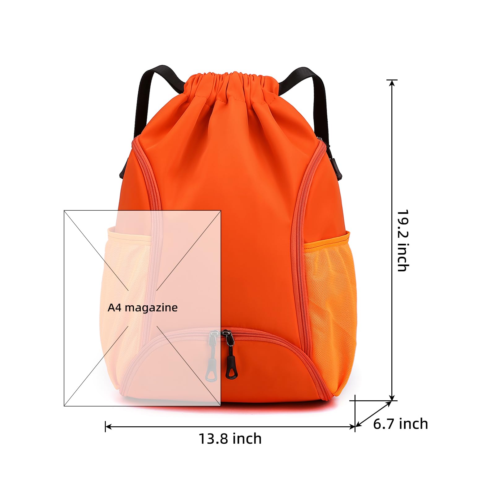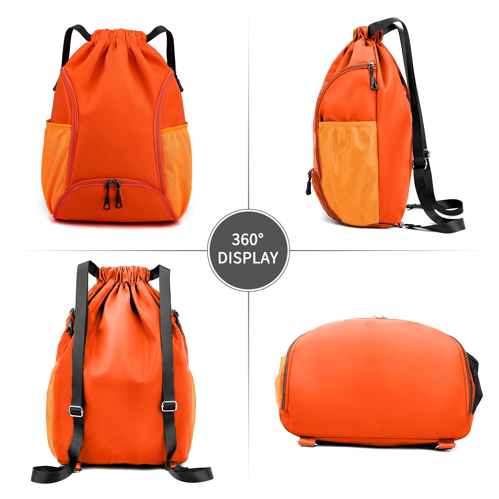 Valleycomfy Sports Gym Bag Drawstring Backpack with Shoes Basketball Bag and Two Water Bottle Holder,Drawstring Backpack for Beach, Pool and Travel,Orange