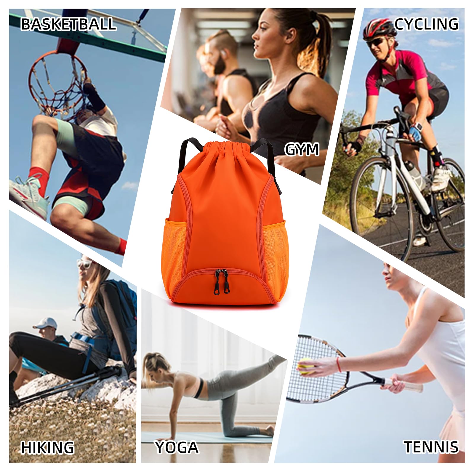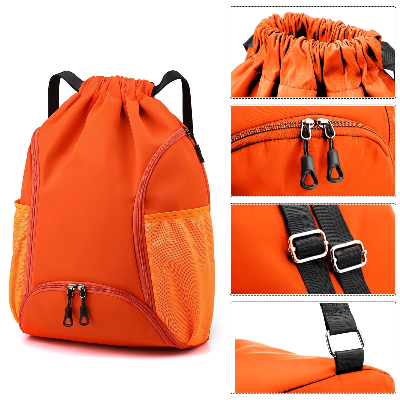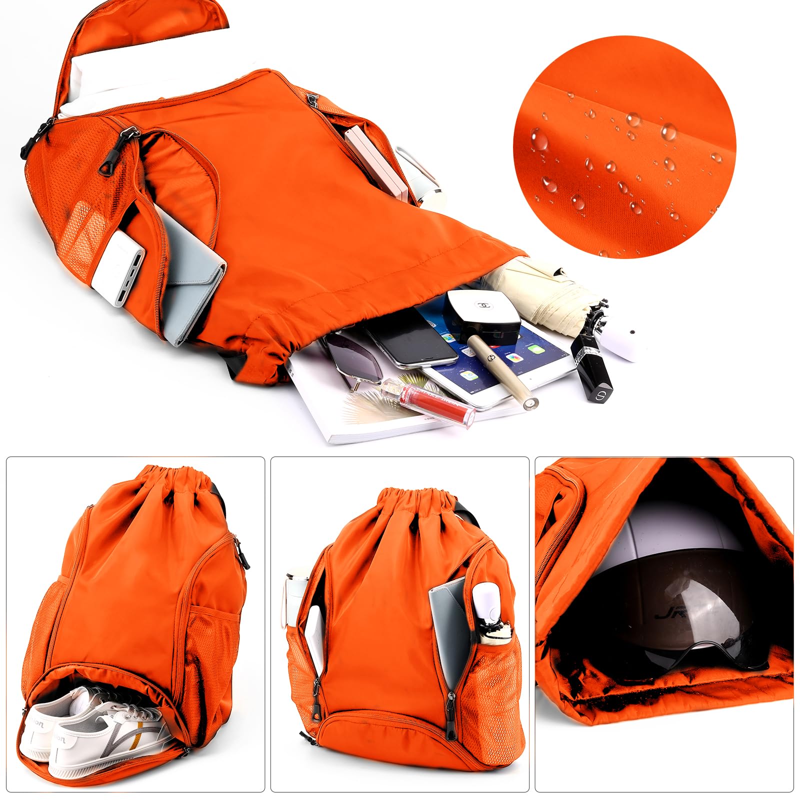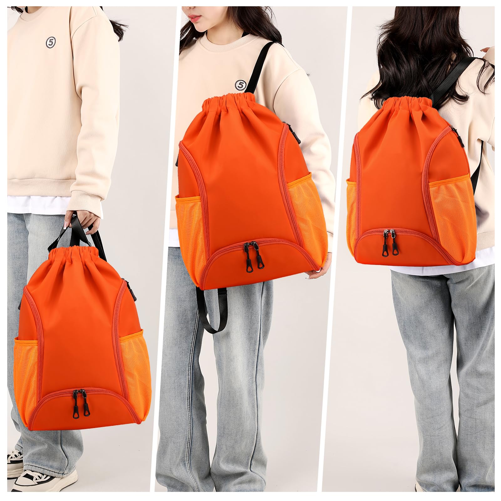 Valleycomfy Sports Gym Bag Drawstring Backpack with Shoes Basketball Bag and Two Water Bottle Holder,Drawstring Backpack for Beach, Pool and Travel,Orange