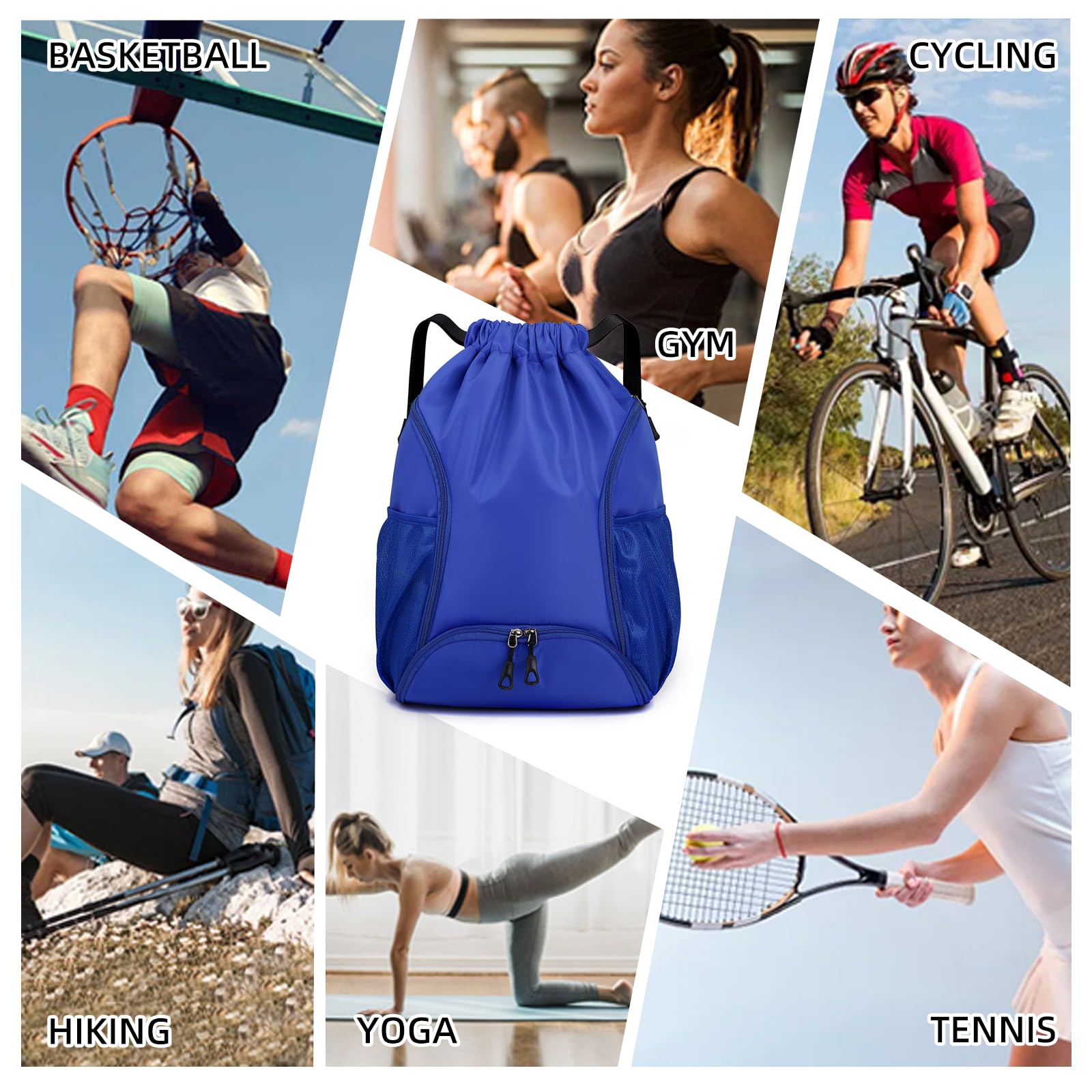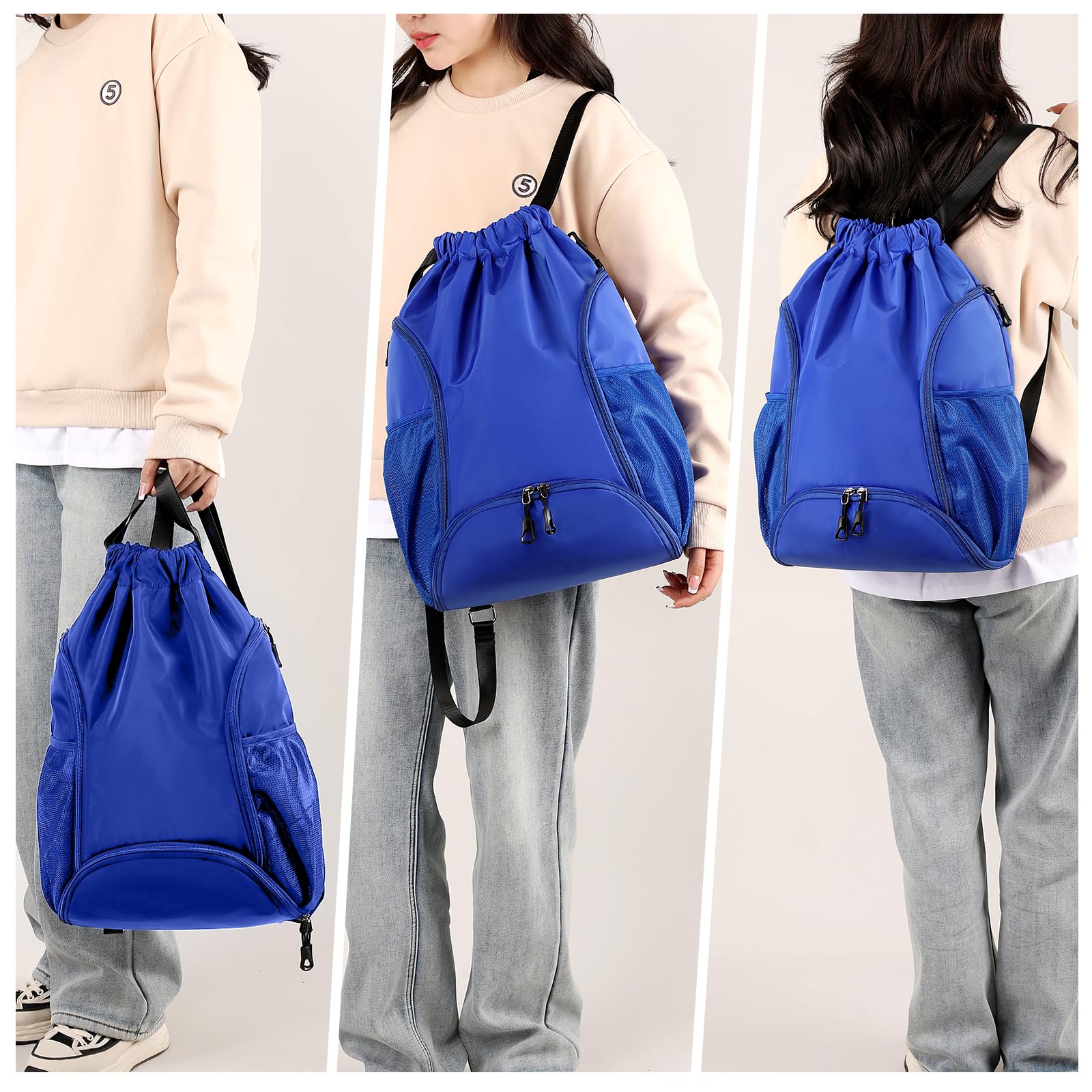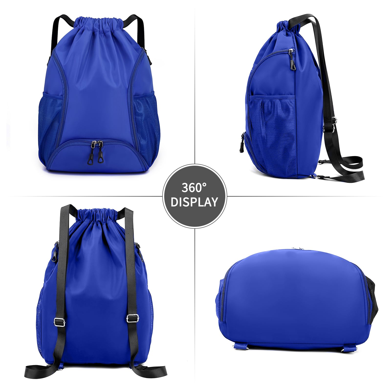 Valleycomfy Sports Gym Bag Drawstring Backpack with Shoes Basketball Bag and Two Water Bottle Holder,Drawstring Backpack for Beach, Pool and Travel,Sapphire Blue