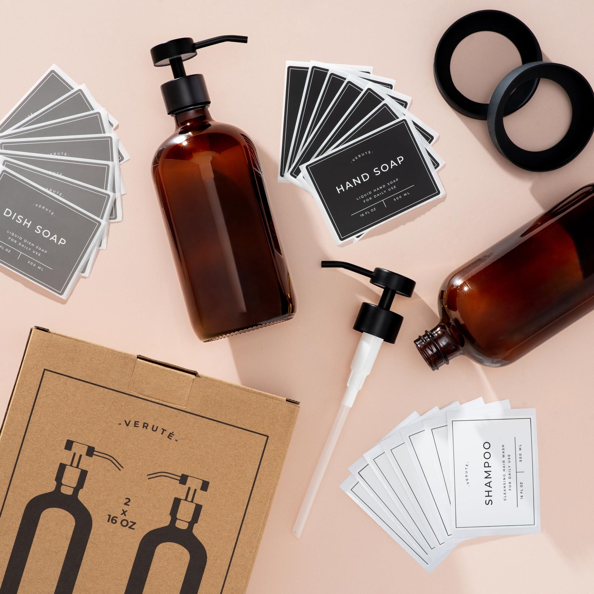 Verute 16oz Glass Soap Dispenser with Stainless Steel Pump, 21 Waterproof Labels, Non-Slip Protective Silicone Pad, Set of 2 for Bathroom & Kitchen (Amber Bottle/Black Pump)