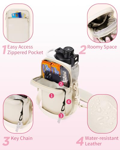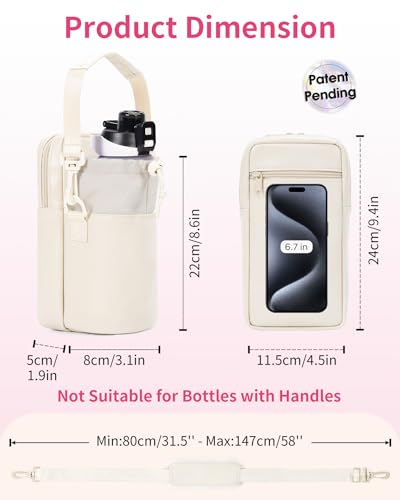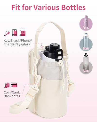 - 【Large storage space and 4 pockets】There is a large zippered storage pocket of the water bottle carrier with strap that can accommodate your phone, keys, glasses, headphones, wallet, and other essentials. This large pocket also includes an inner zippered pocket for convenient organization. There is a back zippered pocket suitable for holding bank cards. Additionally, The main compartment features a drawstring closure for easy insertion and removal of a 32 oz bottle.