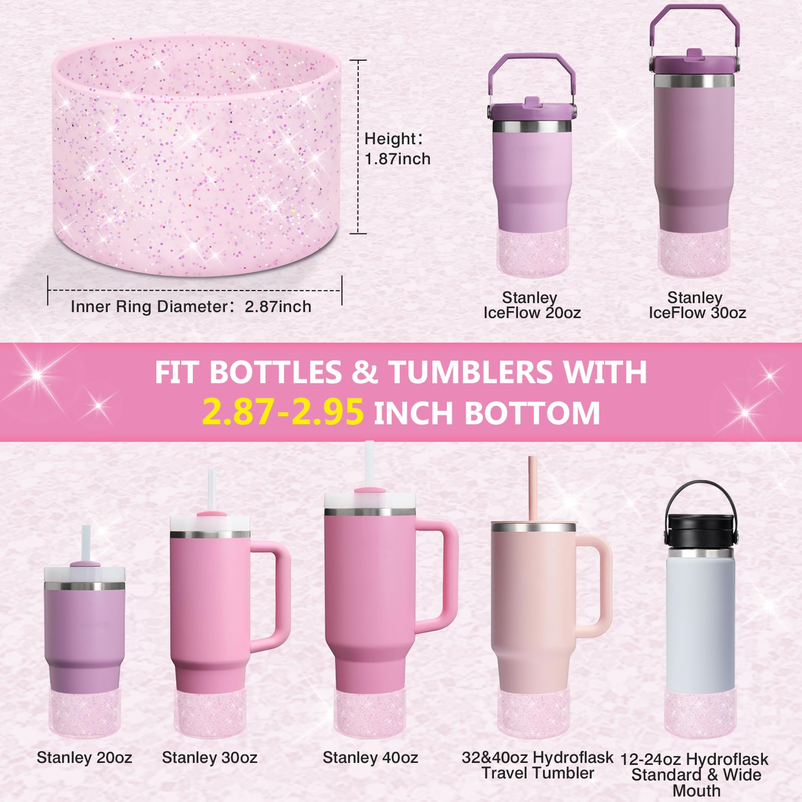 - UNIVERSAL COMPATIBILITY: Designed for bottles with a base diameter of 2.8-3 inches, this dazzling water bottle boot isn't just compatible with Stanley products. It is also compatible with Hydroflask 12-24 oz water bottles